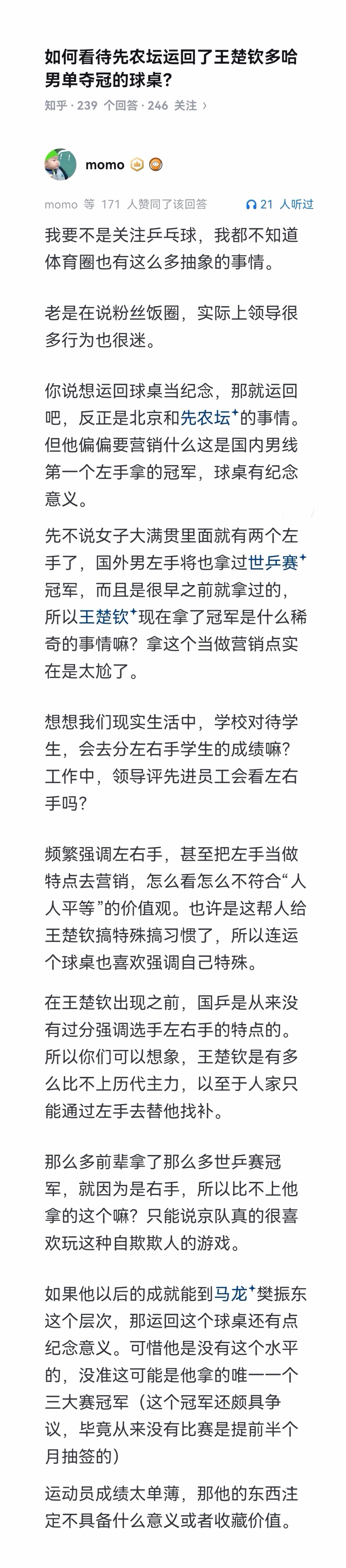延安说多哈球台很有意义,因为单打混双男女双都在这张球台上打的,还有各个冠军和裁判的签名,最后被营销出来仅为三单定海神针买回来。三大赛首冠本是起点,却被奉为高光绝版,井确定不是以爱之名行害之实?如何攀登下一座高峰?怪不得都说乒乓球是行政化饭圈呢。