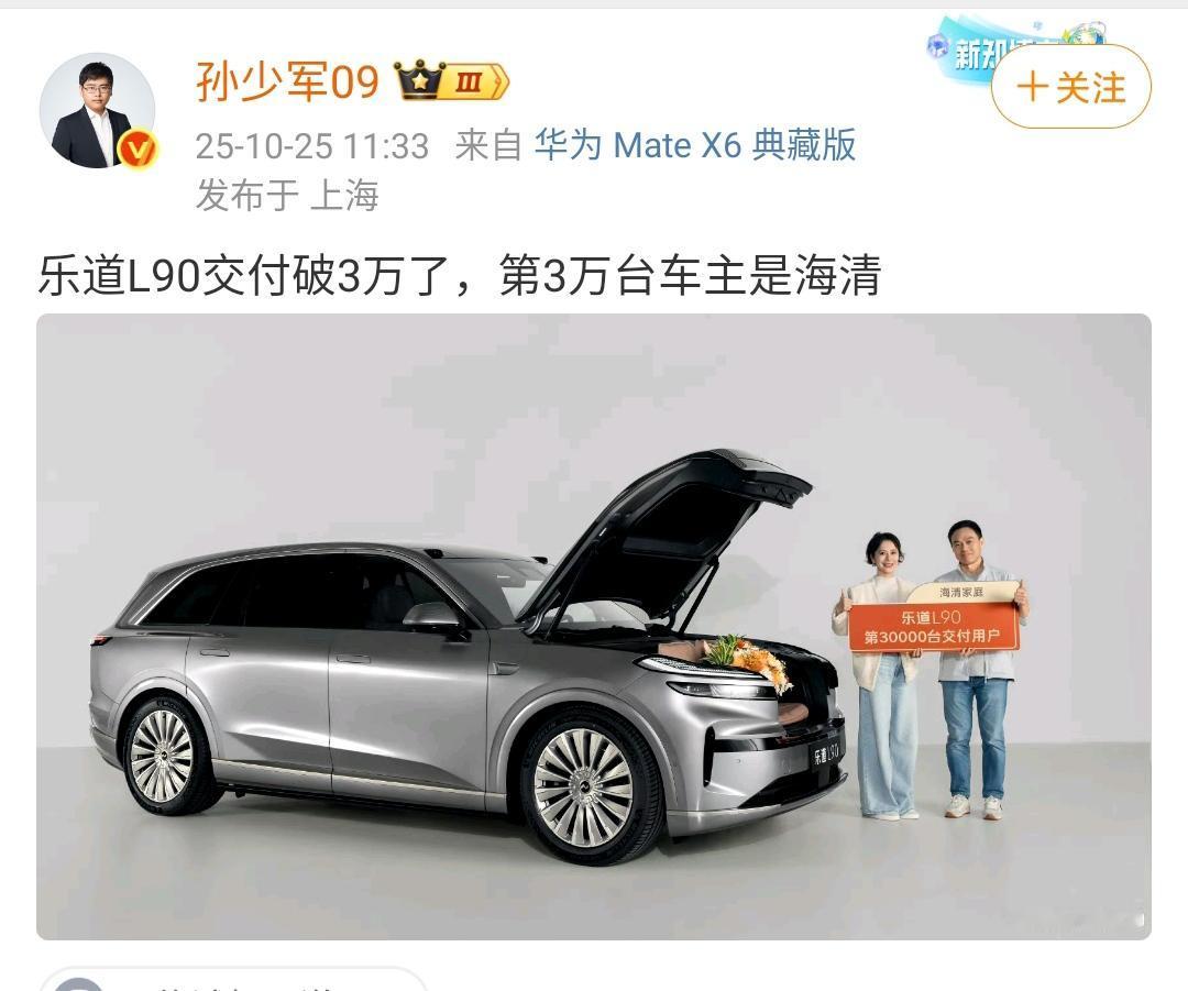 孙少军:乐道L90交付破3万了,第3万台车主是海清 ! 这样的宣传效果好,如果是交给一个普通的车主,说交付量到3万了可能大家都没有印象。 说第3万个车主是海清,这样大家就比较有深刻的印象,相当于为品牌又做了一次宣传。 乐道现在采用的宣传策略比较有效果,车型也卖得非常的好,30万元级别的车型,租电后的价格可以做到比较低,这样也收获了非常多的其他消费者。
