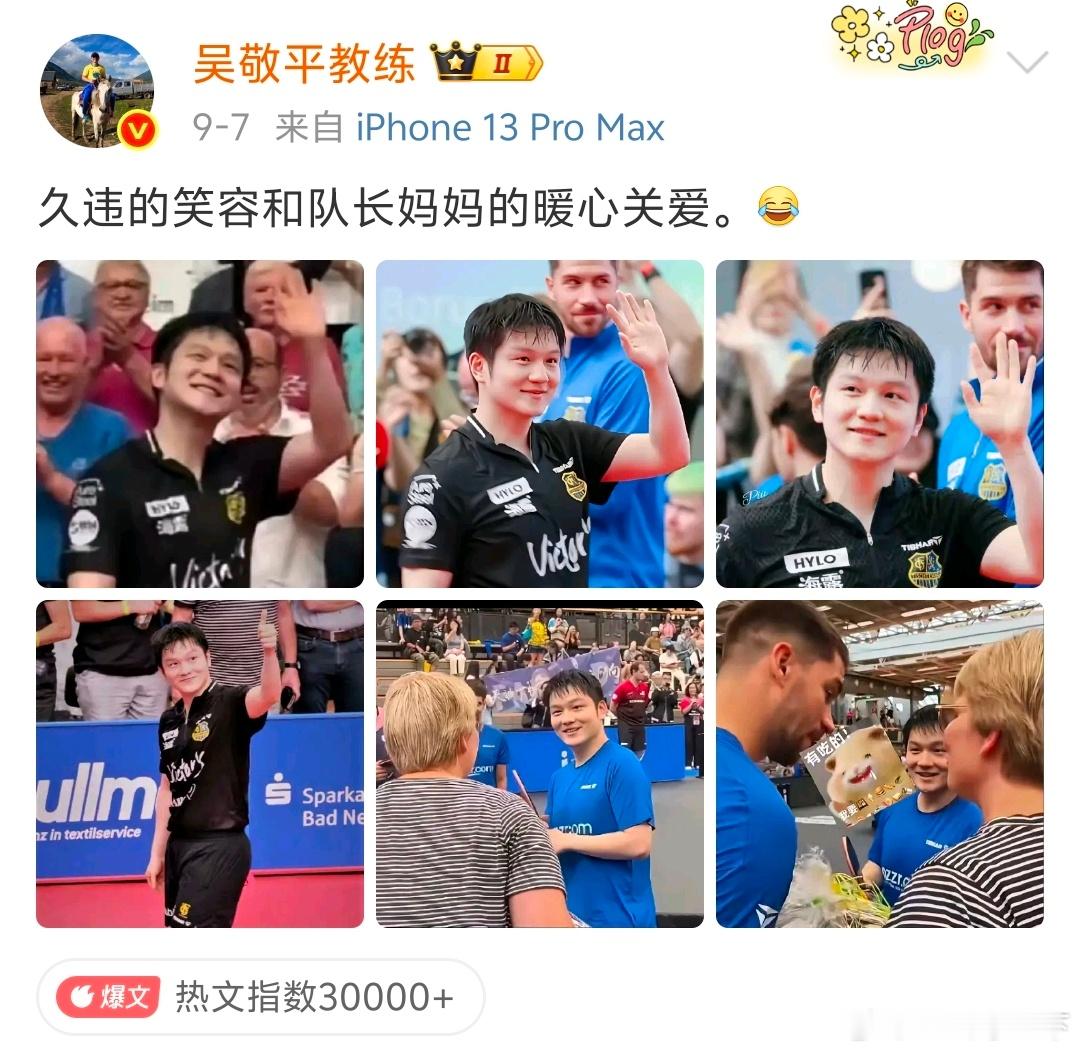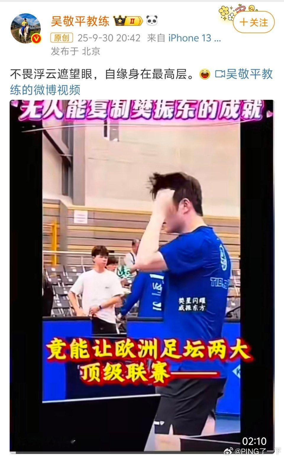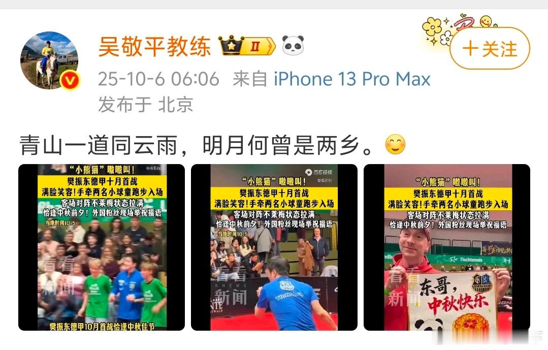 吴敬平发文祝贺樊振东获奖于吴敬平老师而言,对樊振东的认可与惦念,无需直白诉说,皆化作诗文中的暖意,藏在每一句笔墨里。这一份份浸满笔墨的师徒情谊,任谁见了都会满心羡慕。樊振东再获殊荣