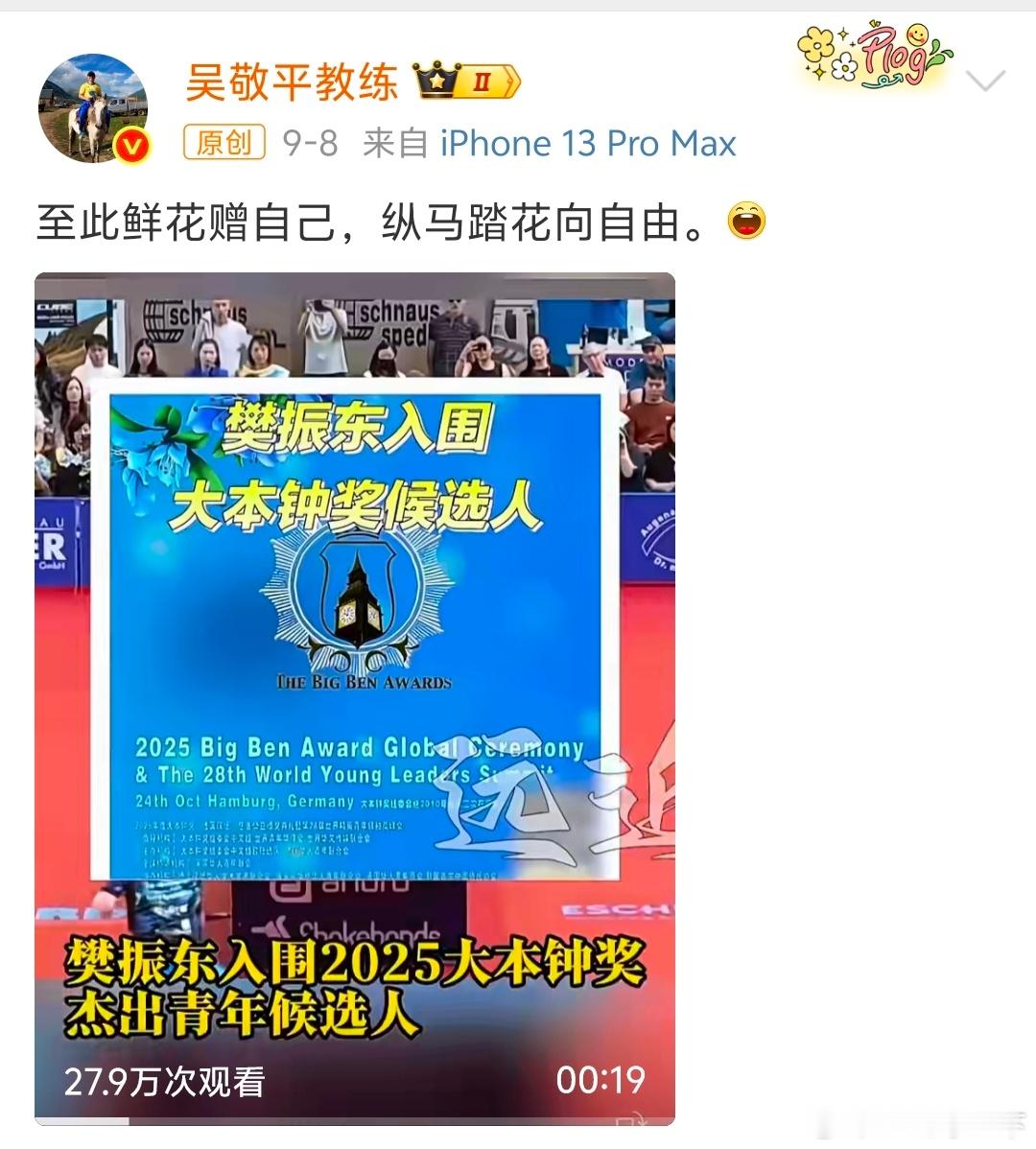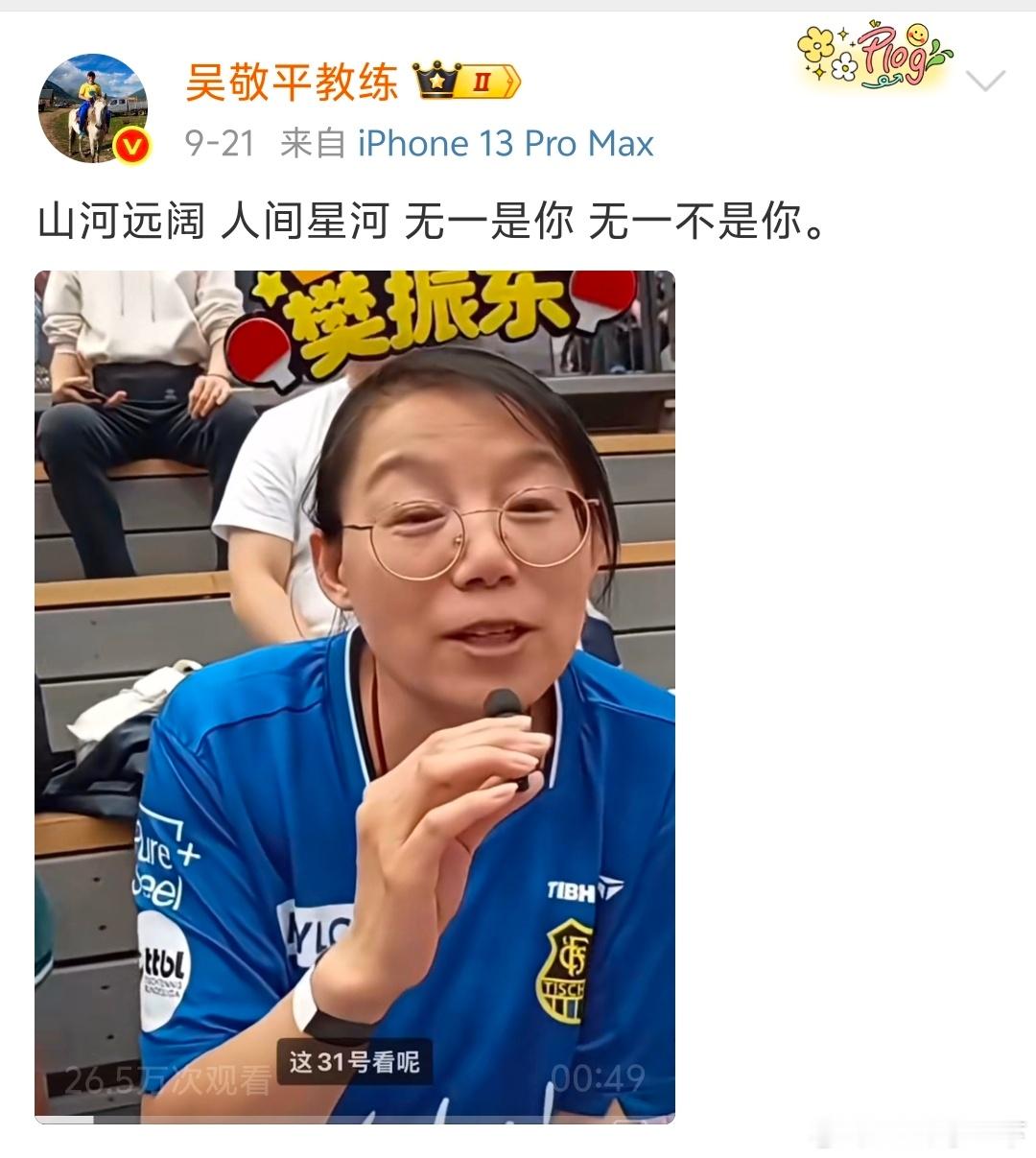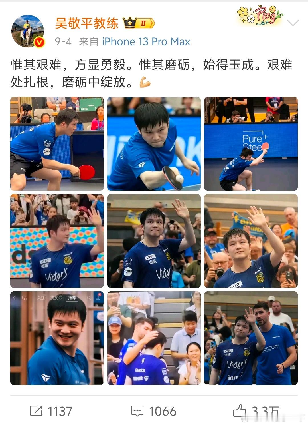 吴敬平发文祝贺樊振东获奖于吴敬平老师而言,对樊振东的认可与惦念,无需直白诉说,皆化作诗文中的暖意,藏在每一句笔墨里。这一份份浸满笔墨的师徒情谊,任谁见了都会满心羡慕。樊振东再获殊荣