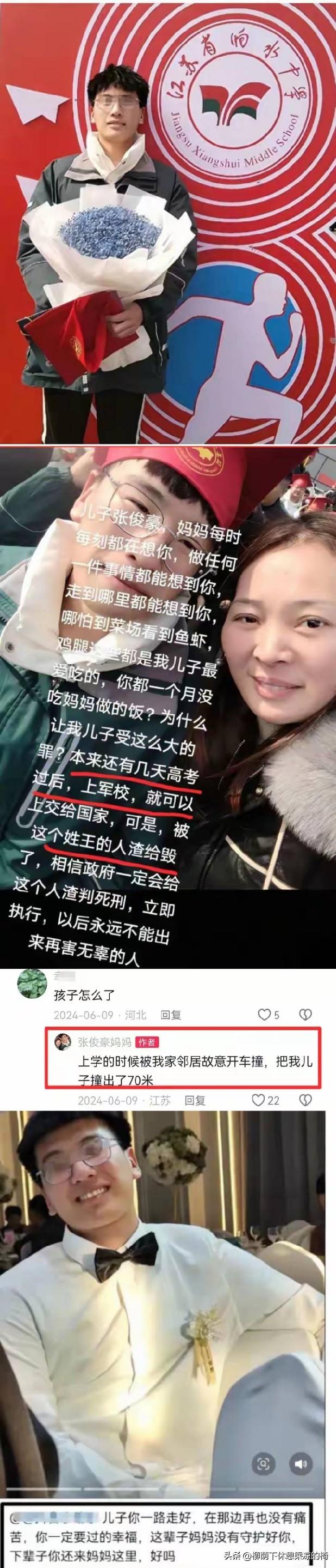 高三男生差几天高考被邻居撞死,母亲哭瘫:我就想要他偿命 江苏盐城响水的张女士,现在每天都要去儿子房间坐会儿,摸着书桌上的高考倒计时日历掉眼泪——上面的数字永远停在“7”,儿子张俊豪没能等到进考场的那天。 去年5月29号下午,18岁的张俊豪骑电动车去学校刷题,身后突然冲来一辆轿车,直接把他撞飞出去。开车的是36岁的邻居王某桂,两家就隔几条田埂,平时抬头不见低头见 。 张俊豪当场昏迷,送到医院就被诊断为脑死亡。张女士守在ICU一年多,砸光了积蓄,还是没能留住儿子,今年7月,孩子终究没挺过来 。更让她崩溃的是,警方调查说,这不是意外,是两家之前因琐事结了矛盾,王某桂是故意报复。“我儿子根本不认识他,没跟他说过一句话啊!” 前些天接到法院传票,案子11月3号开庭,案由写着“故意杀人”。张女士对着镜头哭得撕心裂肺,怀里抱着儿子生前玩的布艺玩偶:“每分每秒都被愤怒填着,整夜睡不着。我不要钱,就想要他偿命,还我儿子一个公道!” 如今家里的台灯还亮着,张俊豪的错题本摊在桌上,可那个盼着考大学的少年,再也回不来了。村里人说起这事儿都叹气,谁也没想到,邻里间的小矛盾,竟毁了一个即将绽放的生命。