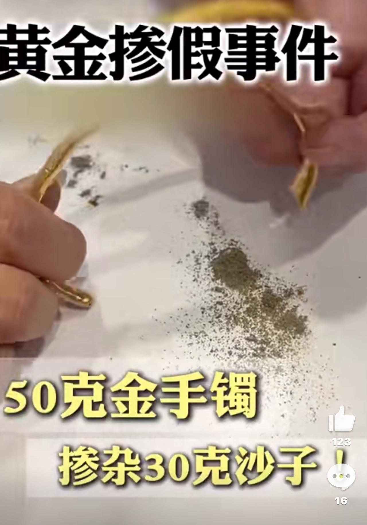 女子拿手镯去改款,万万没想到啊,剪开后才发现,50克的金手镯里,竟然藏了30克的沙子 山东枣庄滕州一位女士两年前在瑞丰金行花数万元买了条足金手链,戴了两年想变现,结果剪开手链后,里面竟掺着大量不明颗粒物,看起来像沙子。她当场报警,店员还提出“换一条同样克数的”,可转头金店就翻脸不认账,说“票据只能证明买过首饰,剪断的手链没法确认是店里卖出的”。 这事儿听着就离谱!黄金作为硬通货,价格透明、鉴定方便,本应是“最省心”的买卖,结果消费者连“买的是真金”都要自证。金店先是“换货”拖延,后是“无法鉴定”甩锅,这波操作像极了“踢皮球”——既不想担责,又不想彻底激怒消费者。更讽刺的是,手链上还刻着金店的钢印,这“铁证”在金店嘴里却成了“不能证明来源”的废铁。 消费者买黄金,图的就是个“真”字。可如今连金店都敢在“真金”里掺沙子,这不是砸自己的招牌吗?要知道,黄金掺假不仅违法,更是在透支消费者的信任。如果连“黄金无假”的底线都守不住,谁还敢把钱投进贵金属市场?更让人心寒的是,面对质疑,金店不是积极解决问题,而是用“走法律程序”当挡箭牌,把消费者推得远远的。 其实,这事儿背后暴露的是行业监管的漏洞。黄金掺假成本低、检测难,普通消费者很难第一时间发现。如果商家都抱着“赌你发现不了”的心态,那市场迟早会变成“劣币驱逐良币”的赌场。好在市场监管部门已经介入,相信真相很快会水落石出。 最后想问问大家:如果遇到类似的事儿,你是选择硬刚到底,还是自认倒霉?评论区聊聊你的看法,说不定你的经验能帮到更多人!