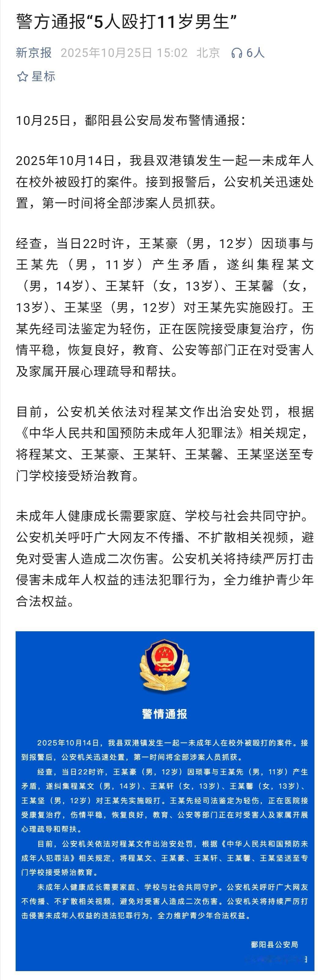 所有参与殴打11岁男生的未成年人,都被送去专门教育学校接受矫治教育。这体现了对暴力、欺凌的零容忍态度。 但矫治教育也好,行政拘留也好,都是针对暴力、欺凌行为的问责。更需要在日常的学校教育与家庭教育中,真正重视对学生的反欺凌、反暴力教育,既要保护自己不受伤害,又不能去伤害别人。
