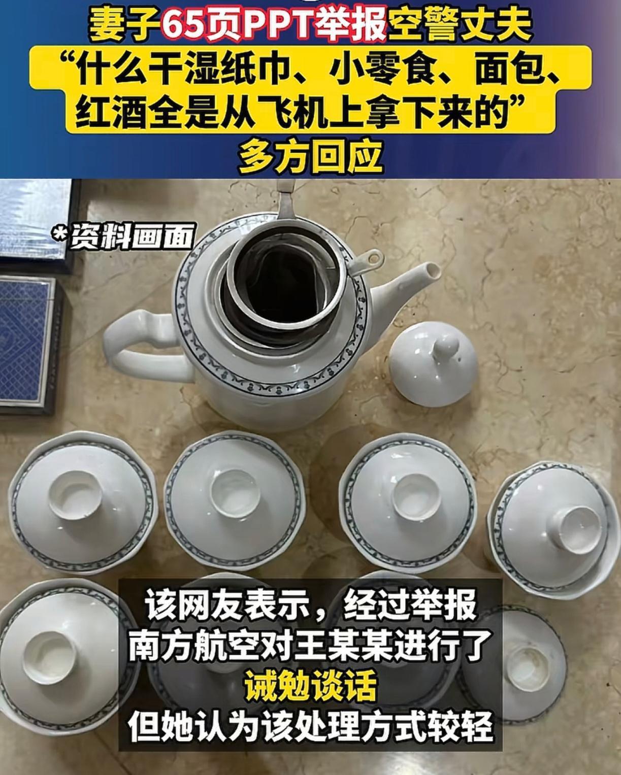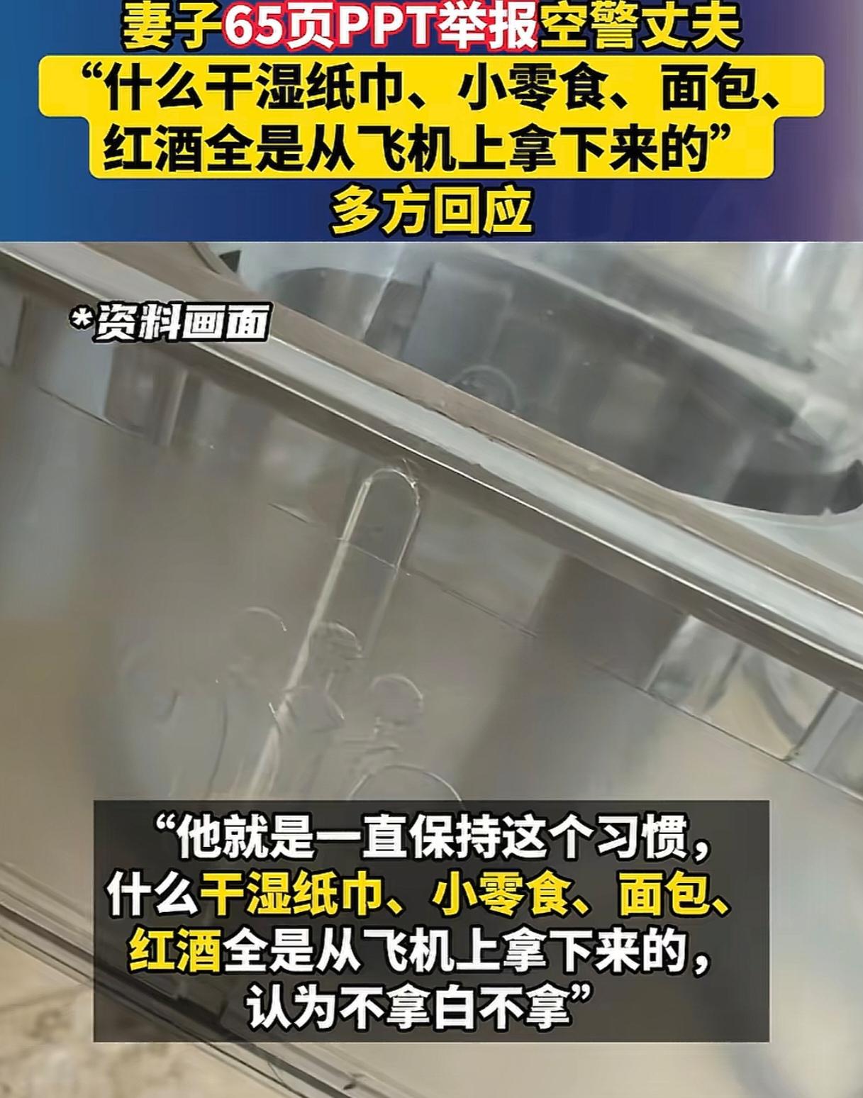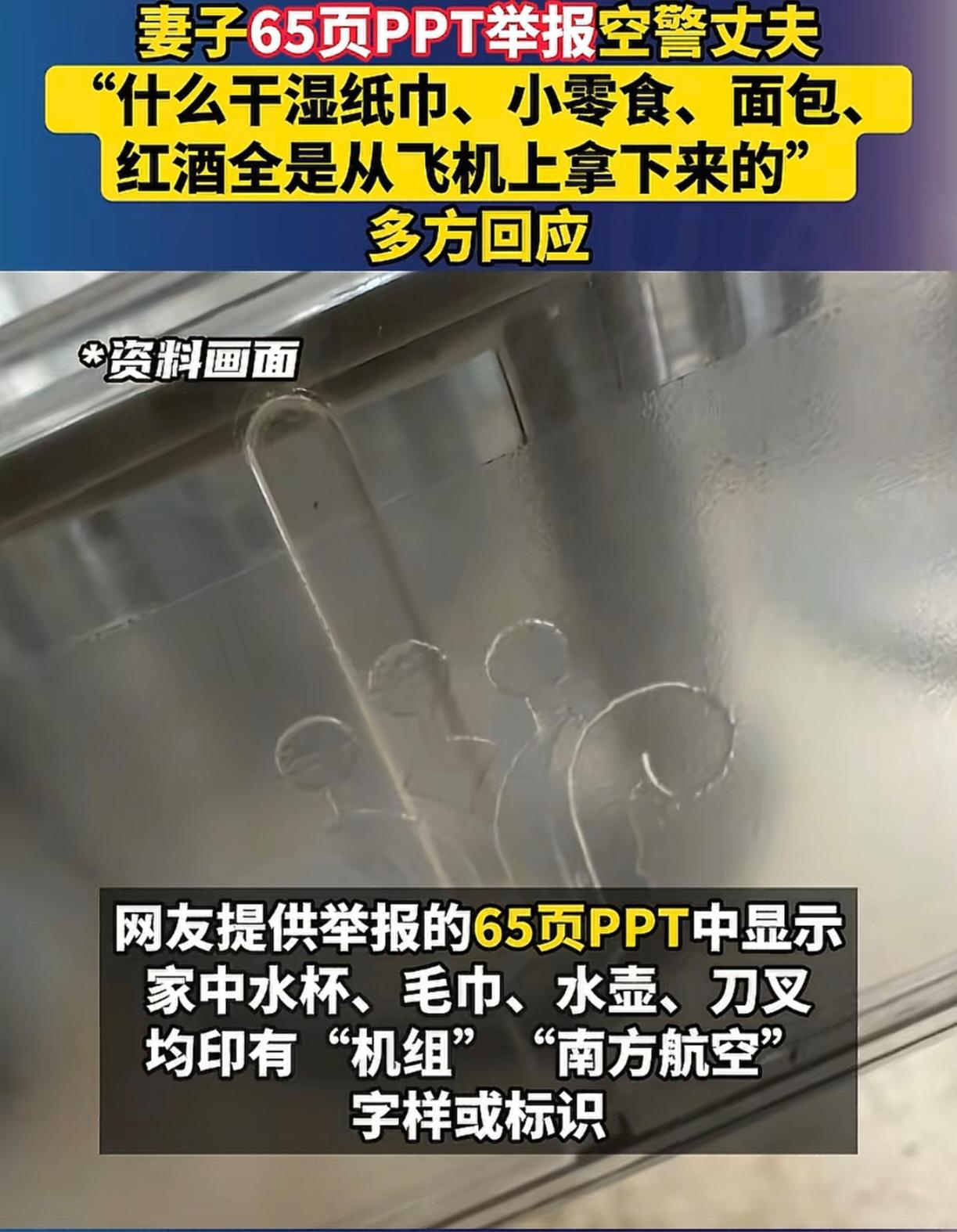 不得不说这个女子很正直啊,大义灭亲,灭了自己老公[泪奔]。南航一空警的妻子见不惯老公爱占小便宜的行为。怒做65页PPT向老公领导举报老公这么多年来多次偷拿飞机物资放在家中,像什么干湿纸巾,小零食,小面包啊,红酒等等,还认为不拿白不拿。 后来经过调查之后,南航纪委对女子的老公做出了诫勉谈话处理。本以为事情就会这样过去,但女子似乎有些不依不饶,觉得处罚过轻,要求从重处罚[笑哭]。不知道这老公对女子做了啥,导致妻子这么恨他。 不得不说,这女子确实厉害。这些东西能写65页的PPT,换做我写几页都得抓耳挠腮的。