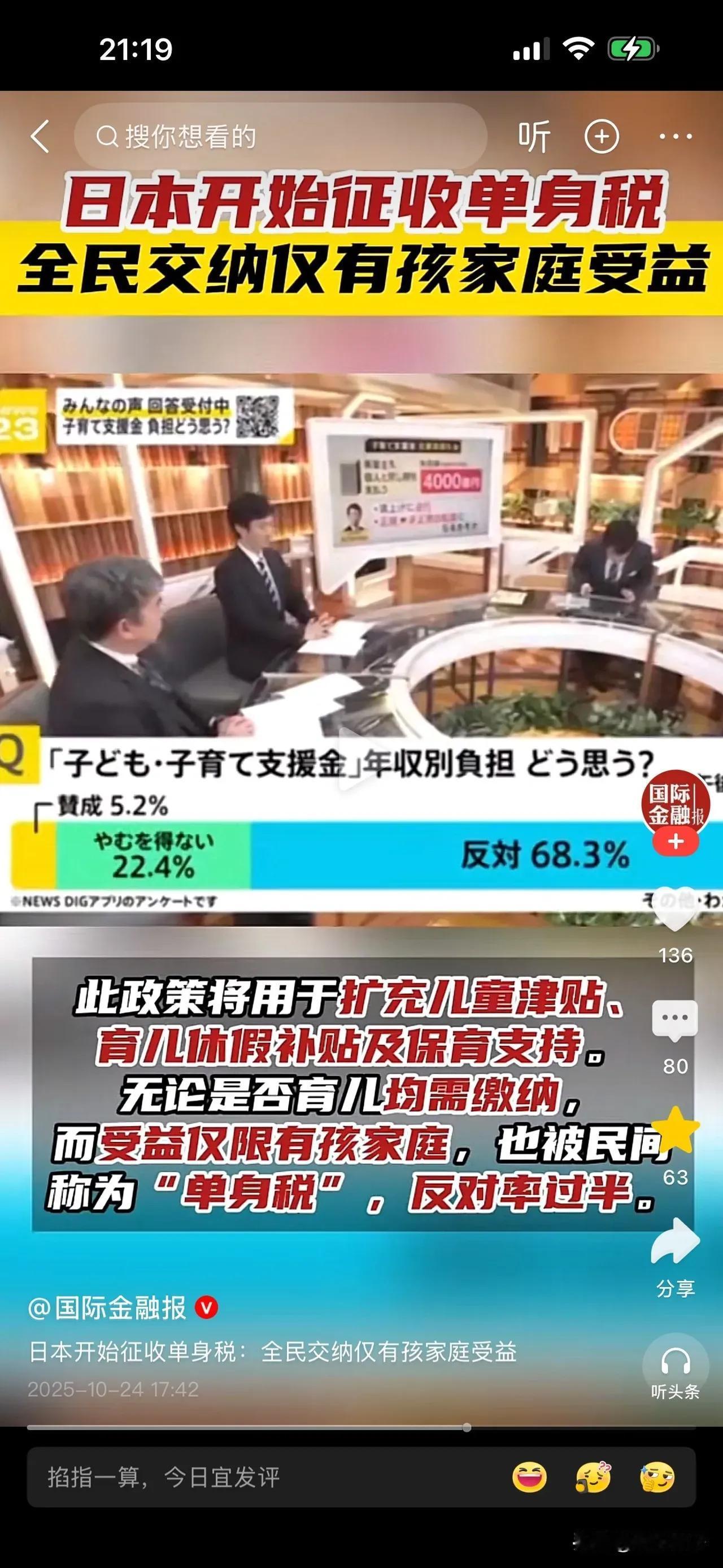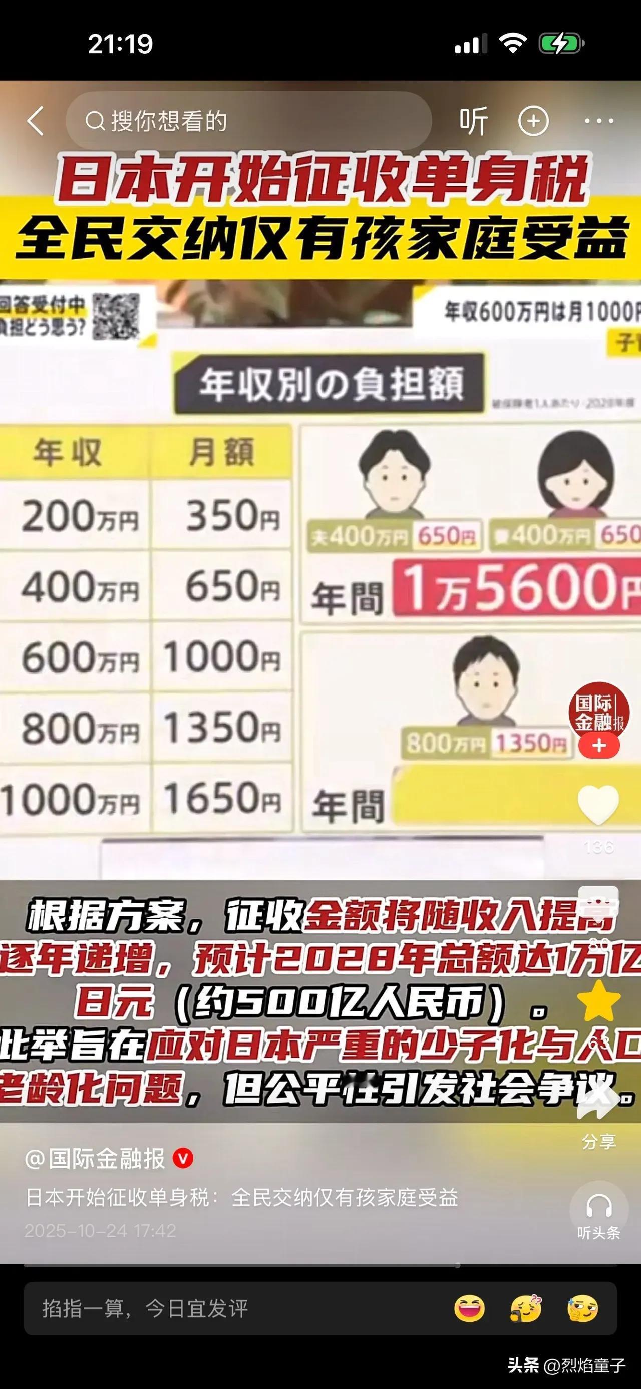 好消息,日本开始收单身税了,开始是一年合人民币120至680元,逐年递增到200至92 0元,我们是不是又要摸着日本过河啊 有网友评论说: 1,只要哪国有税收我们肯定虚心学习。哪国有什么待遇我们从来不跟。 2,一年680,30年也不过区区两万出头,跟彩礼比起来不值一提 3,中国和日本不一样的,她们生活好,是个人不愿意的行为, 晒图笔记大赛