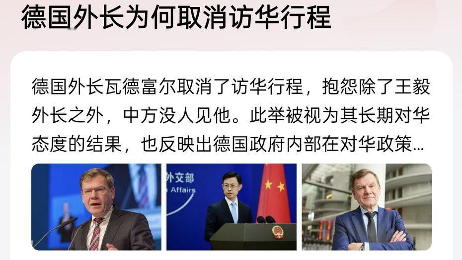 我们是几千年的礼仪之邦,德国外长取消访问那是他的事,于我们何干,况且他来我们会有对等接待,结果他想的谈更多,关键他谈了有用吗?现在的德国与其说冯德莱恩是他们的总理兼外长还差不多。