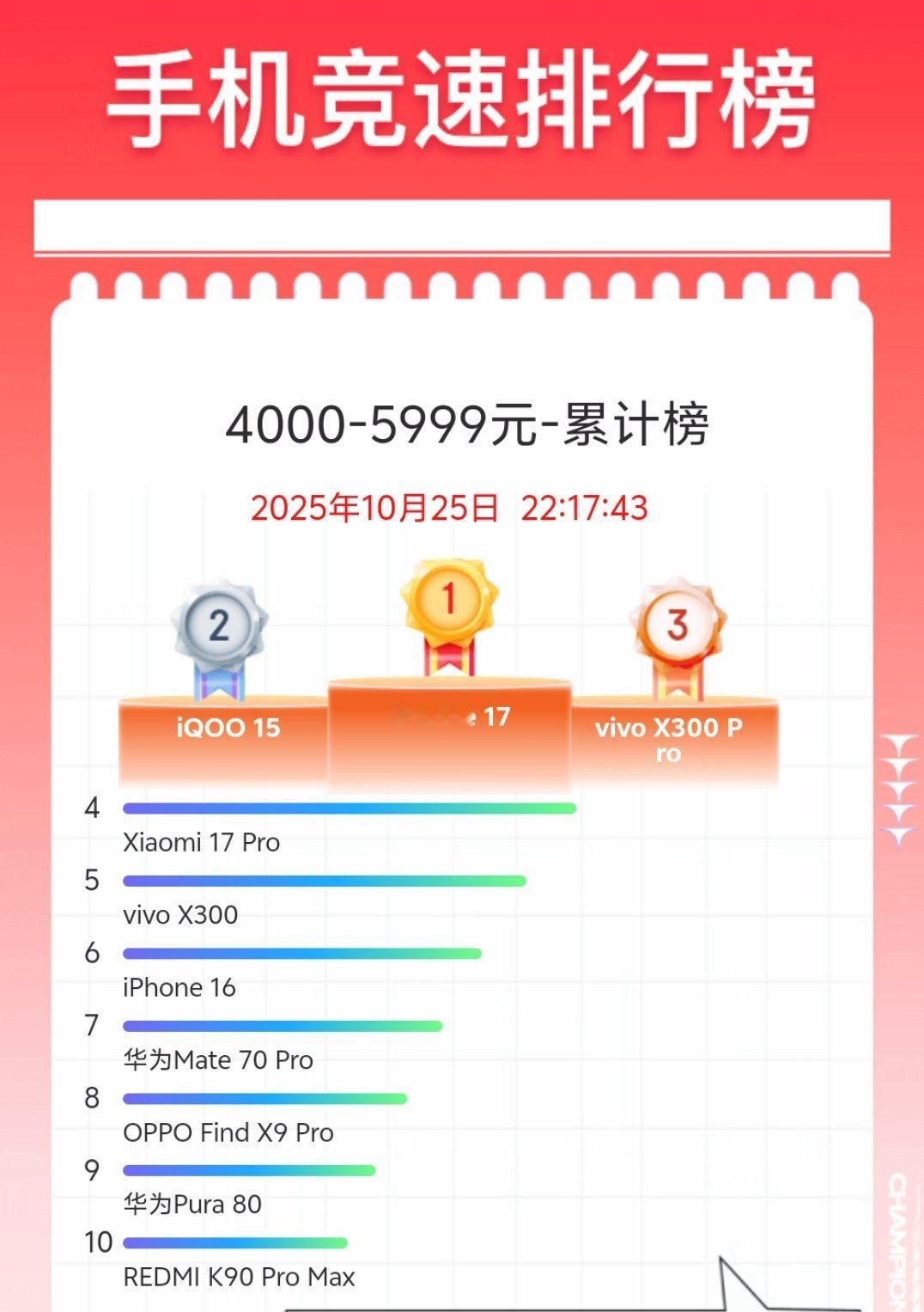 iQOO 15今年不但首销猛,后续依旧给力,开售五天,每天稳定前十,4000-5999这个价位仅次于iPhone17。