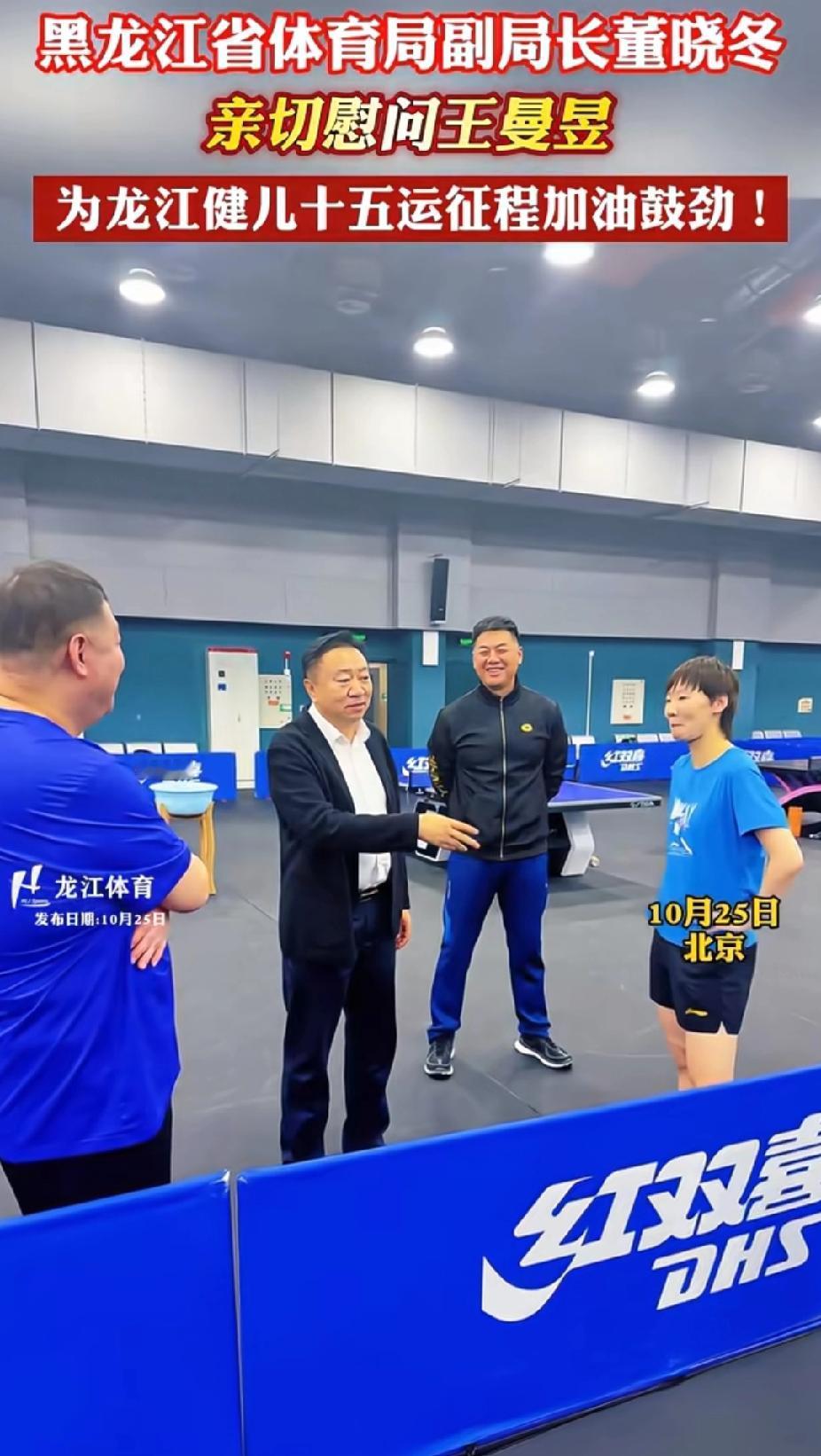10月25日北京训练场馆内,黑龙江省体育局副局长董晓冬亲切慰问乒乓球运动员王曼昱,现场与运动员握手交流,为即将征战十五运的龙江健儿加油鼓劲。 从训练场馆的乒乓球台旁,到暖心的现场互动,这份关怀是健儿们赛场拼搏的有力后盾,期待龙江体育健儿在十五运赛场再创佳绩!