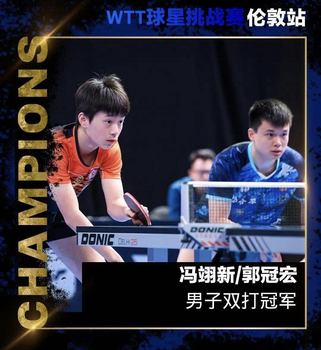 WTT伦敦球星挑战赛结束了男双和女双决赛,女双决赛是一场中国德比战,石洵瑶/张翔宇3-0战胜覃予萱/纵歌曼夺冠,男双决赛,中国台北年轻组合冯翊新/郭冠宏以9-11、12-10、9-11、11-9、11-1逆转击败中国香港组合黄镇廷/陈颢桦,获得冠军。