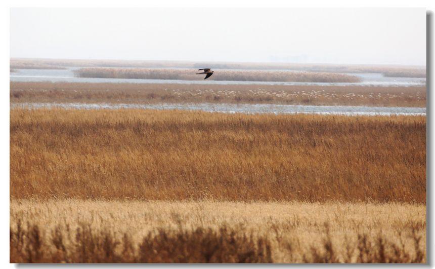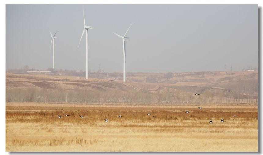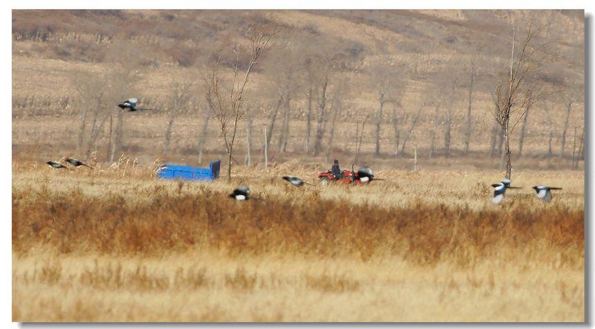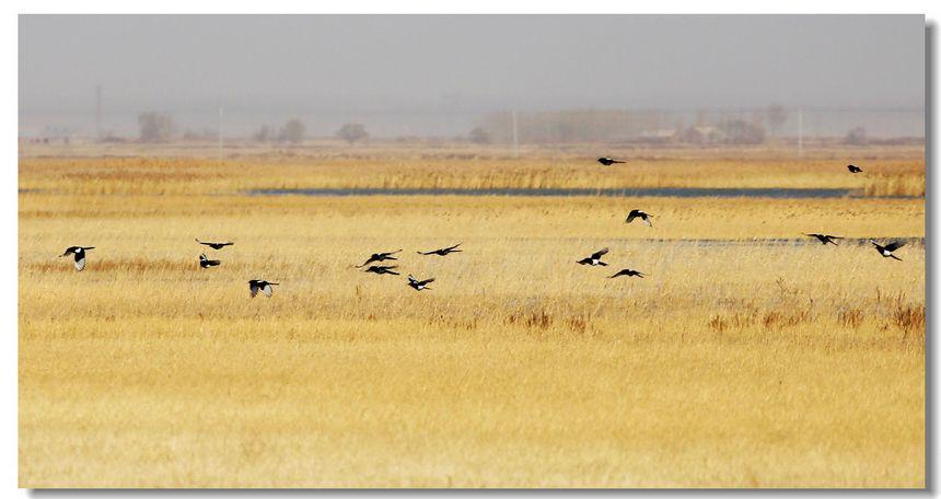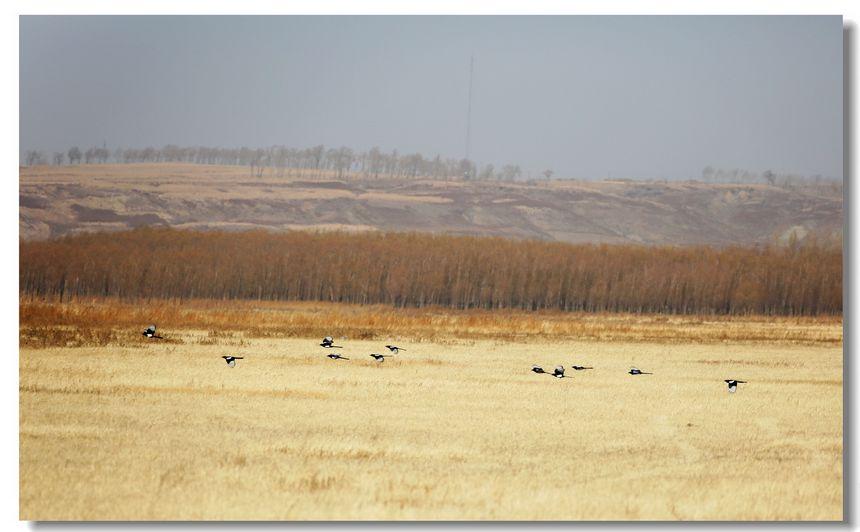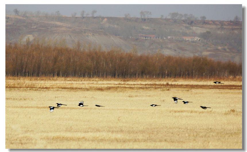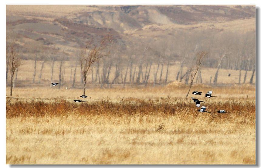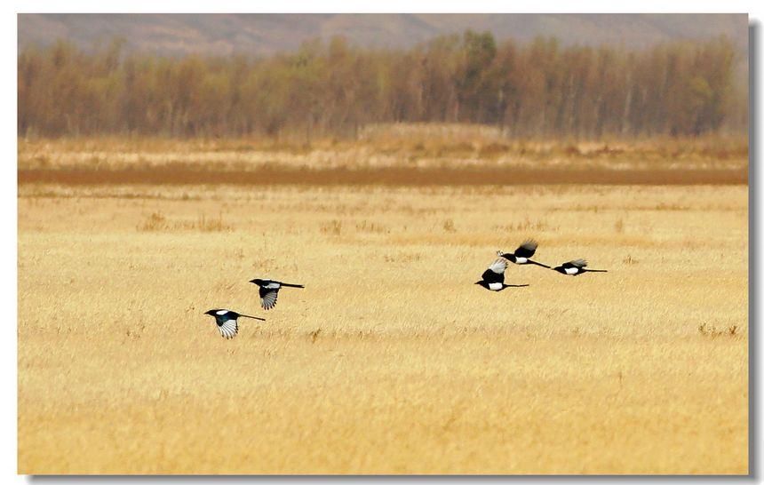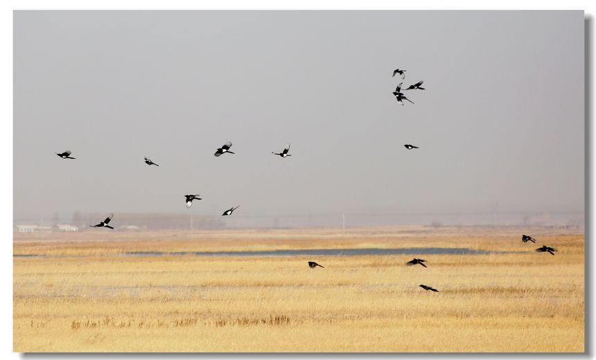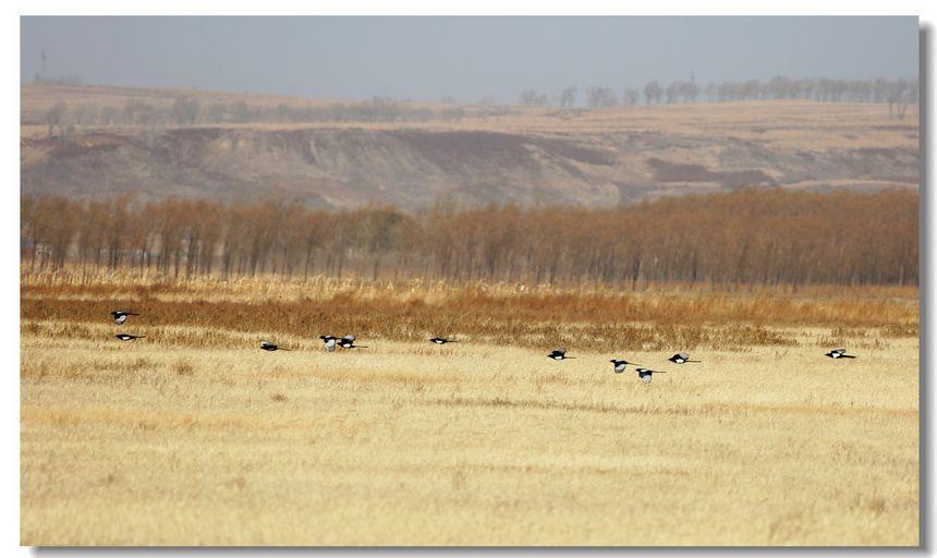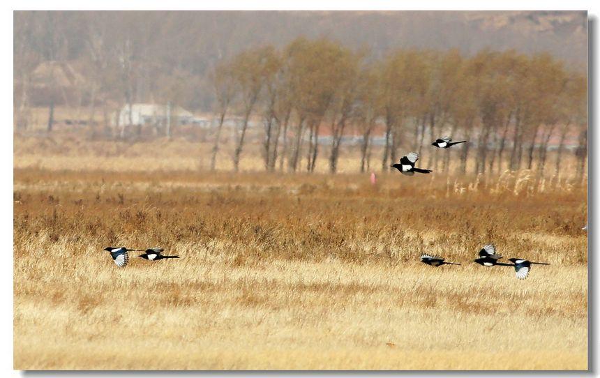 深秋时节,长春农安波罗湖湿地鸟儿翻飞,田野上“编队”的喜鹊点缀出一幅晚秋图画。