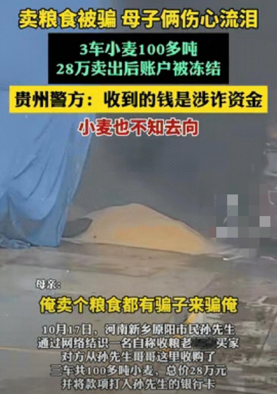 河南新乡,一对母子卖小麦,3车小麦共100多吨,卖了28万,买家把钱打到他们卡上,一家人很高兴,可高兴劲儿还没过多久,她们却发现自己的银行卡被冻结了! 头天还在算着这笔钱够还春耕贷款、给孙子交学费,第二天去银行取生活费,柜员一句话直接把母子俩砸懵了:“您的卡被异地公安冻结了,涉嫌接收涉诈资金。”母亲当时就蹲在银行大厅哭了,手里还攥着卖粮时的过磅单,上面的数字被眼泪打湿了一片:“这是100多亩地的血汗钱啊,晒了整整半个月,怎么就成赃款了?”谁能想到,网上找来的“爽快买家”,竟是给他们挖了个大坑。 这28万的价格其实不算离谱。2024年河南周边小麦平均收购价1.25元/斤,他们卖的是优质强筋麦,加上100多吨的批量交易,1.4元/斤刚好凑够28万 。问题出在买家身上——这人是儿子在粮食交易群里认识的,自称“粮商”,上门看货时连价格都没还,还主动提出“现结不拖欠”,装粮时派了两个小伙盯着过磅,全程客气得挑不出错。钱到账那晚,母子俩还炖了排骨庆祝,现在想来,那“爽快”根本就是为了让他们放松警惕。 儿子第一时间打买家电话,听筒里只剩“您拨打的号码已关机”。他抱着最后希望跑派出所,民警一查就出了结果:打款账户里有12万是电信诈骗受害者的钱,骗子用赃款买粮变现,把母子俩当成了“洗白资金的工具人”。这就是典型的“涉诈资金流转冻结”,公安按资金流向追踪,不管收款方是不是故意的,先冻卡再核查,跟之前郑州卖金条、呼伦贝尔卖牛被冻卡的套路一模一样 。 民警让他们赶紧找齐证据:过磅单、聊天记录、小麦质检报告,一样都不能少。母亲翻箱倒柜找了整整一天,连三年前的卖粮账本都翻出来了,嘴里念叨着“早知道该跟老主顾交易,网上的人信不得”。儿子则跑遍了镇里的粮站,找站长开了“本地优质麦行情证明”,证明28万价格合理,不是虚高的“好处费”——这步太关键了,能直接证明交易合法,避免被当成“帮信罪”嫌疑人。 有人肯定要问,好好卖粮怎么会卷入诈骗?这正是骗子的阴险之处。农业农村部去年公布的坑农骗局案例里就提过,骗子专挑农户下手,利用大家“重人情、轻凭证”的习惯,用“高价收购、当场打款”当诱饵,实则在进行赃款转移 。2022年涉农洗钱案都涨了17%,粮食、牲畜这些大宗交易,成了骗子洗白资金的新渠道,想想都让人后怕。 好在母子俩的证据链完整,民警核实后出具了“善意取得证明”——这是法律上的关键认定,只要能证明交易真实、价格合理、不知情,就不用担责,卡也能解冻。但过程真折腾,前后跑了派出所5趟,银行3趟,整整半个月没睡好觉,春耕买化肥的钱还是找亲戚借的。儿子说:“以后就算价格低两毛,也得找有营业执照的粮站,再不敢信网上的‘甜言蜜语’了。” 那些骂农户“贪便宜”的人,根本没站在他们的角度想。种100亩小麦要投多少本?种子、化肥、农机费加起来近10万,能多卖几千块对农户来说不是小数。骗子就是掐准了这份不易,才敢肆无忌惮设局。更可气的是,他们坑的不仅是钱,还有农户对陌生人的信任。 合法交易不怕查,但得留好“后路”。卖粮时一定要让买家出示身份证、留营业执照复印件,转账备注“小麦货款”,别用现金交易。真遇到卡被冻结,别慌,第一时间报警,把交易凭证全摆出来,公安会还你清白。这不是小题大做,是无数农户用教训换的经验。 各位读者你们怎么看?欢迎在评论区讨论。
