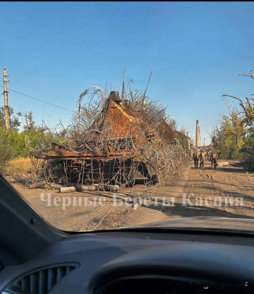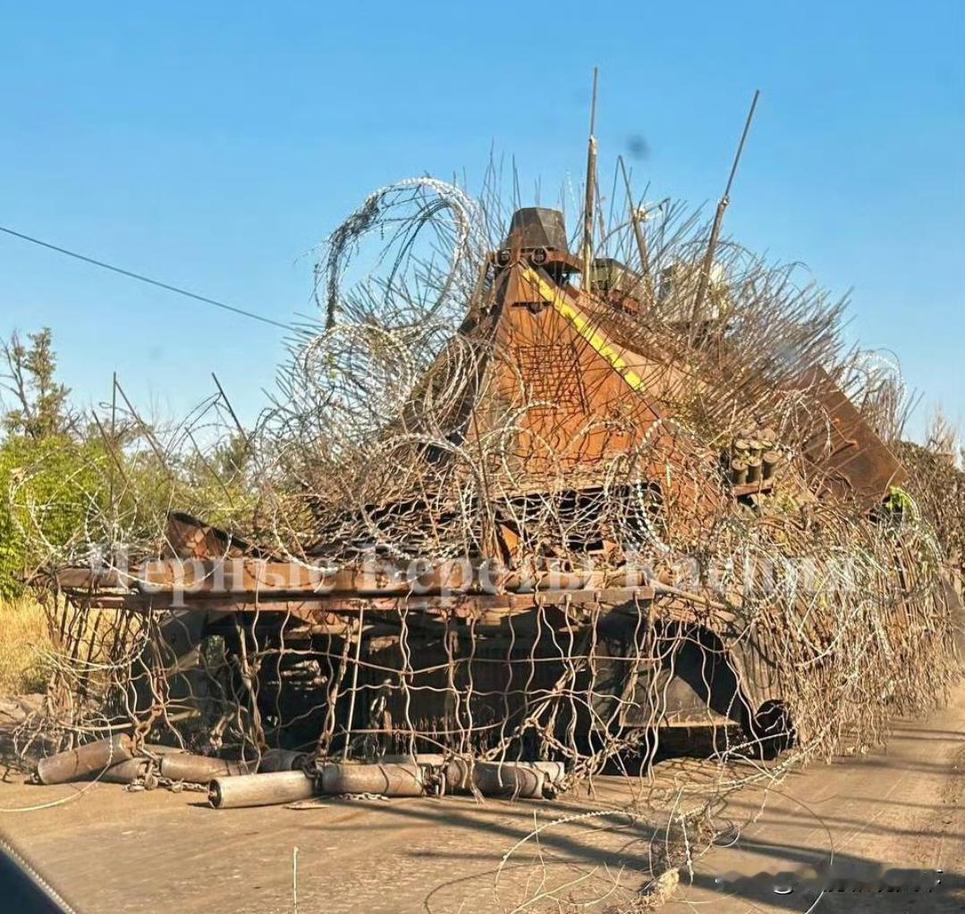 这是什么东西?俄军坦克被魔改成这样你们见过吗?用四个字形容“乱七八糟”,远看像座山丘,近看上一堆草丛或者垃圾堆。 坦克炮塔上方用钢板焊接成像屋顶一样,又在钢板上焊接密密麻麻的钢条,像炸了毛的坦克,又在钢丝条旁边围绕一圈钢丝圈。坦克周围全部被钢丝条和钢丝圈围绕,坦克后面又拖了几个炮弹壳,俄国人这是搞什么? 为了应对乌军的无人机,俄国人可以说是想出了很多奇葩的应对方式,简直就是把坦克胡搅蛮缠!花里胡哨,或许就连俄国人自己都看不懂吧! 俄军把坦克胡搅蛮缠成这样,基本已经失去了机动性,观察视线也受阻!虽然上看坚不可摧,可以防住很多无人机的攻击!但基本上也是活靶子了。 就像俄军和乌军的“刺猬”坦克一样,本以为可以抵挡很多架无人机攻击!但到了实战,两三架都把坦克炸趴窝了。无人机时代让坦克非常尴尬,但坦克在前线也非常至关重要。