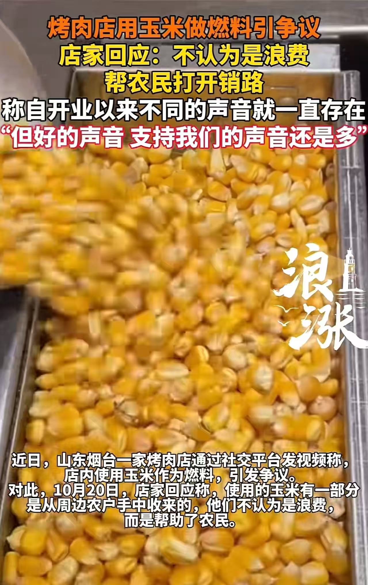 面对烤肉店用玉米做燃料的做法,各种指责不绝于耳,甚至还有网友进行了投诉。