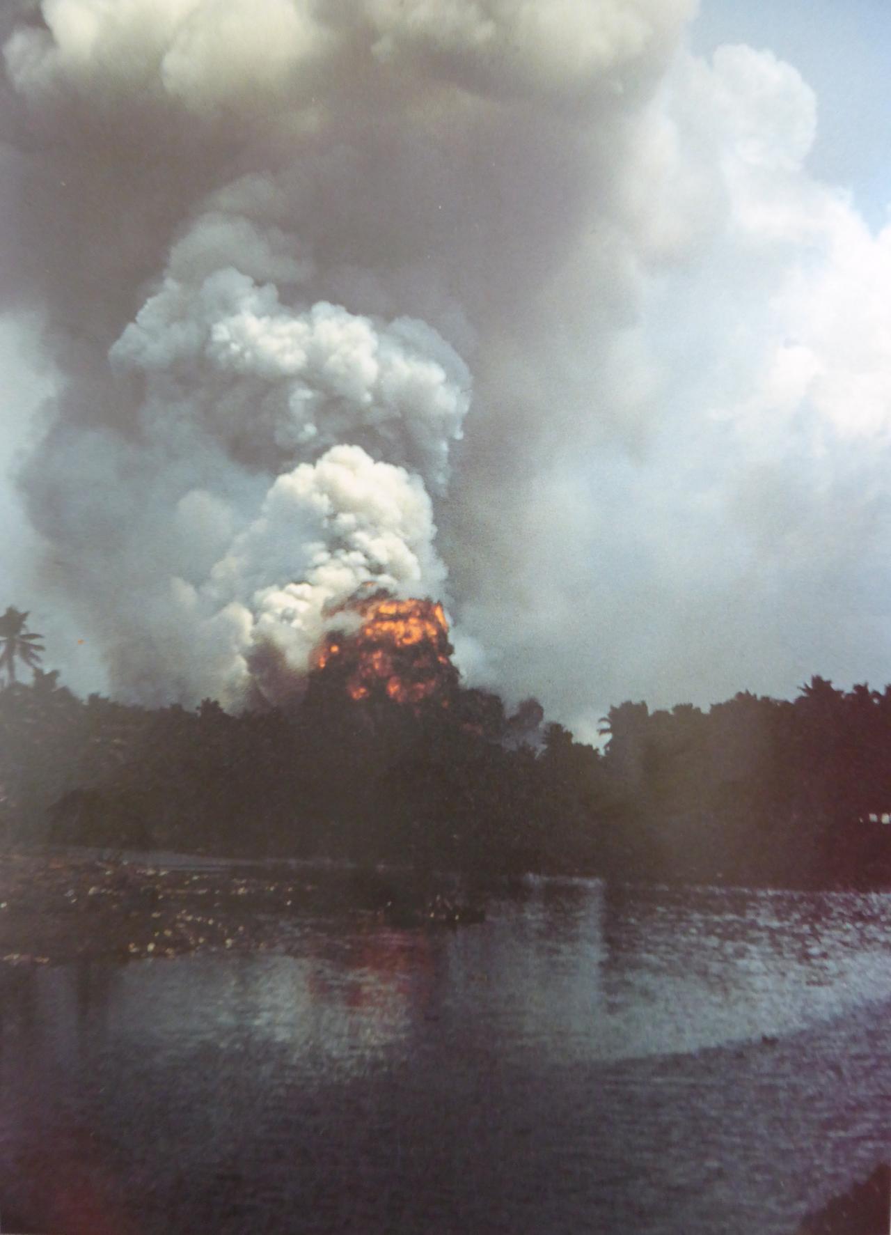 日军欢欣鼓舞,美军没受到太大影响——1942年11月26日,所罗门群岛,瓜达尔卡纳尔岛。当天,岛上的美军弹药库发生爆炸。大家可以看出,浓烟直达天际,仿佛火山爆发一般。 瓜达尔卡纳尔岛是西南太平洋所罗门群岛的最大岛屿,1942~1943年日美双方在此展开长达六个月的争夺战。 图中爆炸的弹药库位于美军防线后方。由于瓜岛战役消耗惊人(美军单日炮弹消耗量最高达900吨),前线堆积的弹药极易因日军空袭或保管不当引发连锁爆炸。当时日军对此很开心,但实际上这次爆炸并未影响战局走向。无它,当时美军的军工生产和后勤补给能力太强悍了。这是作为“穷光蛋帝国主义”的日本所无法想象的。