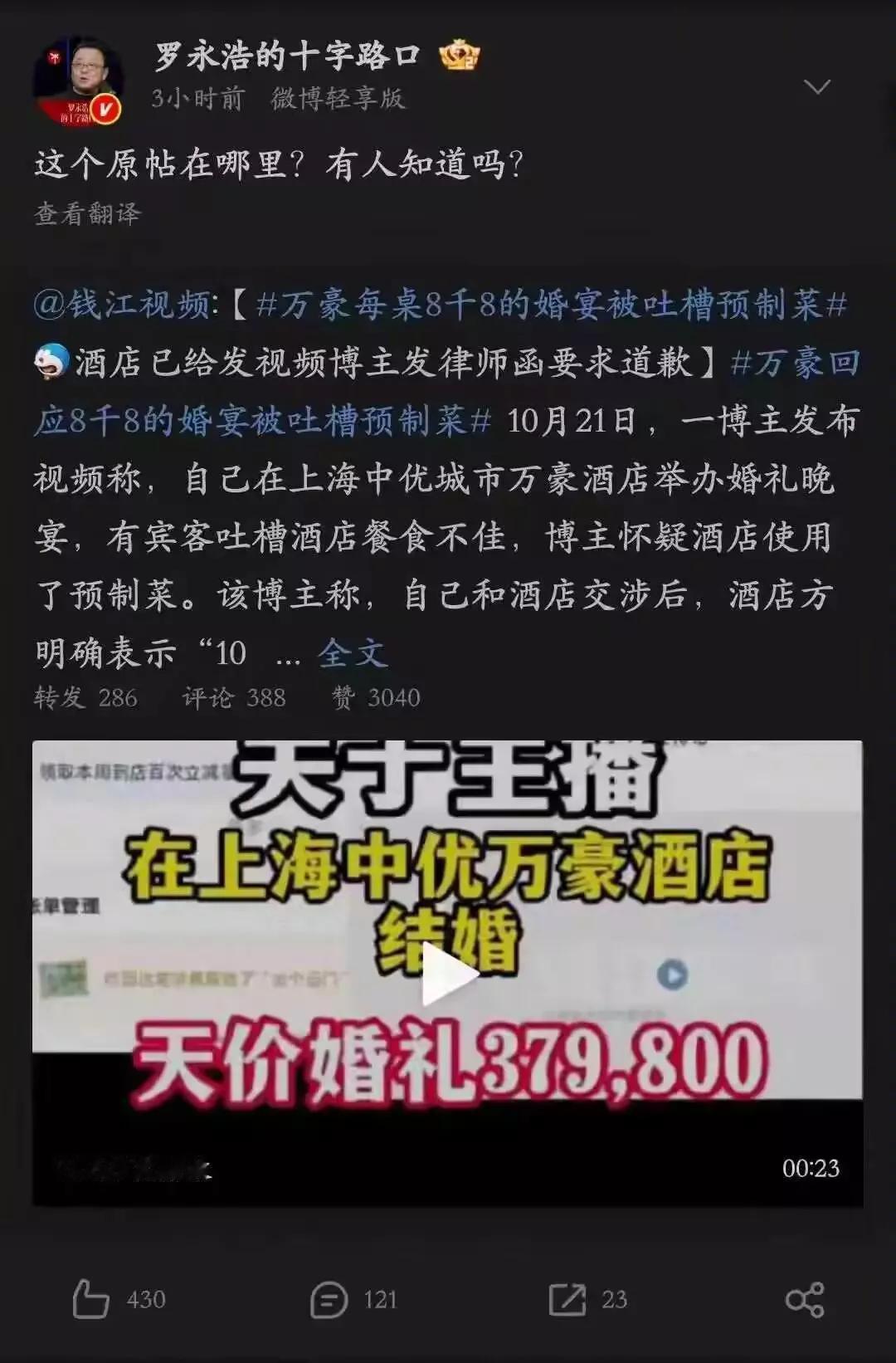 花了37万办婚宴,来宾居然没吃上一口热菜!上海博主的吐槽炸了锅。五星级万豪酒店的后厨,堆满袋装猪蹄,冷冻虾,所谓现做的八宝饭,也是拆包加热的预制品。新娘子推心置腹,白切鸡带着血水端上桌,脸都丢尽了! 酒店咬死绝对无预制菜,反手一封律师函警告博主删视频。可当对方要求看监控时,他们却秒变鸵鸟,没了下文。这波操作,连罗永浩都坐不住了,直接微博寻人。我来帮!网友乐了,酒店本想捏软柿子,没想到却又撞上老罗这块钢板。 说到底,谁反感预制菜了?大家痛的是花大钱当冤种!8888元一桌,连知情权都被踩脚底。事件闹到这步,不止是婚宴糟心,更是给所有端架子的大牌敲钟!时代变了,消费者可不好糊弄了!