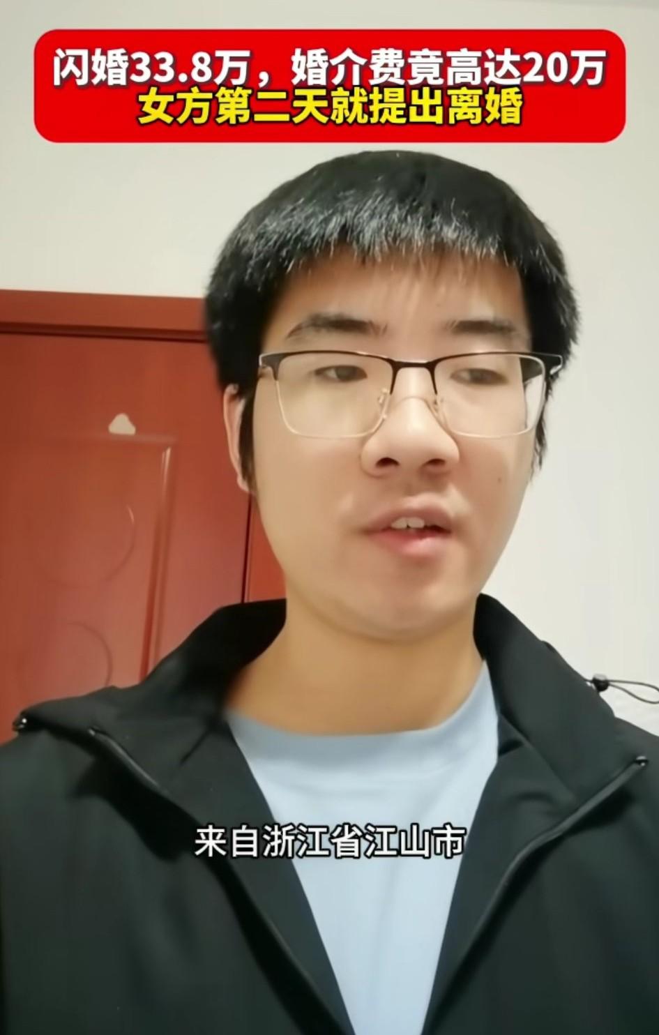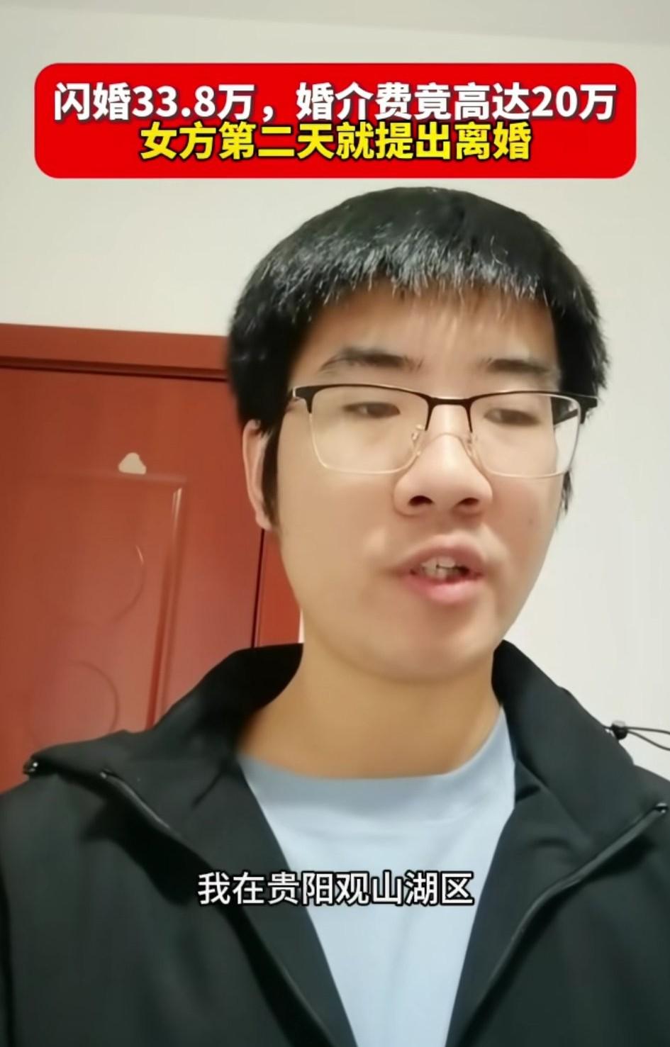 浙江衢州一男子曝光贵阳闪婚骗局,花费 33.8 万,婚介费竟高达 20 万。女方第二天就提离婚…… 男子最后提醒大家:不要来贵阳闪婚! 网友表示:看着这个男的长相也挺板板正正的,说话也很利落。又能一下子拿出三四十万,怎么在当地就找不到一个女的呢?真的是有点想不通! 这种骗婚的例子身边比比皆是,怎么就是有人前赴后继的往那个坑里面跳呢?