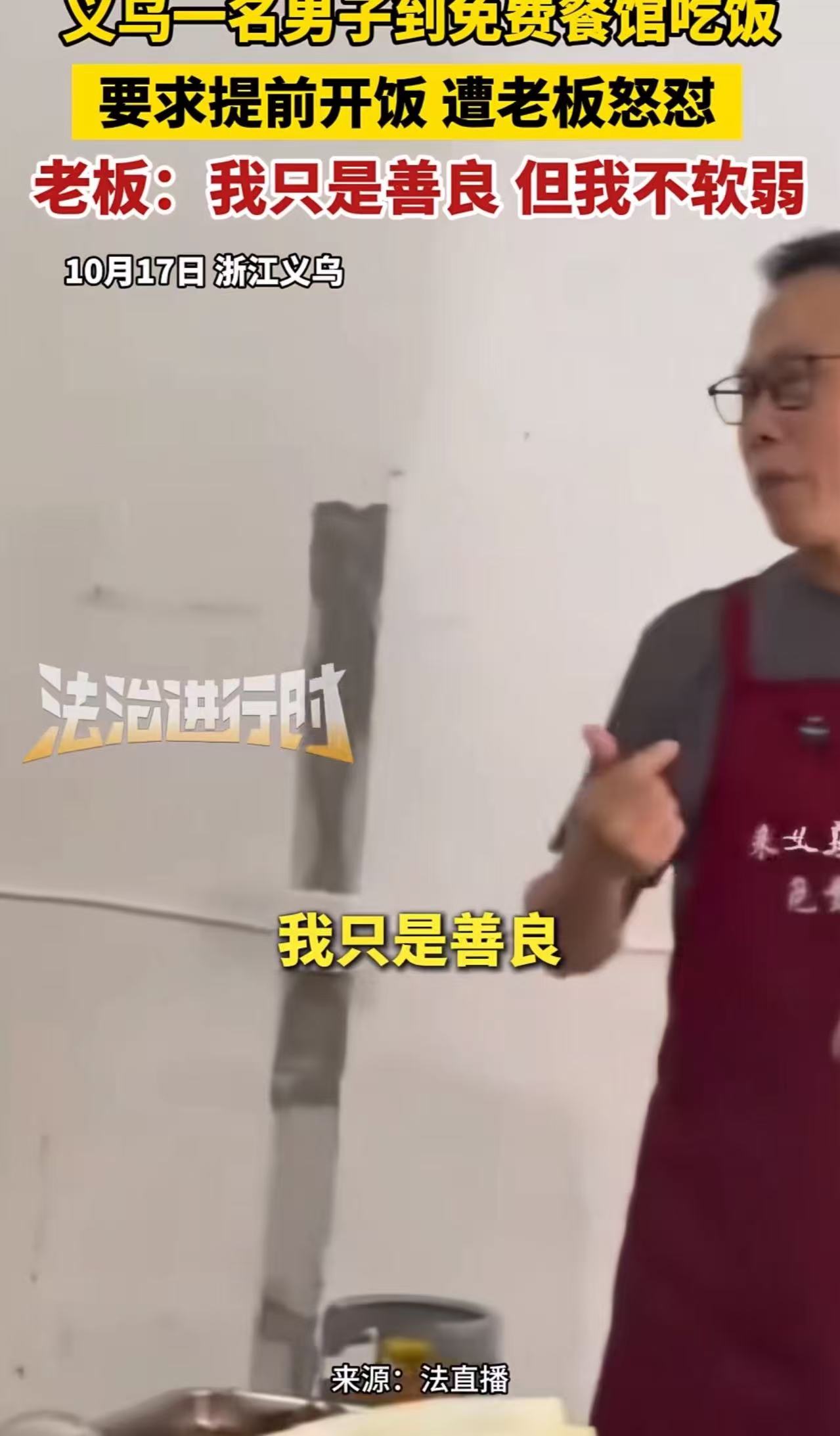 义乌,一名男子到免费餐馆吃饭,要求提前开饭,遭老板怒怼:“我只是善良,但不是软弱