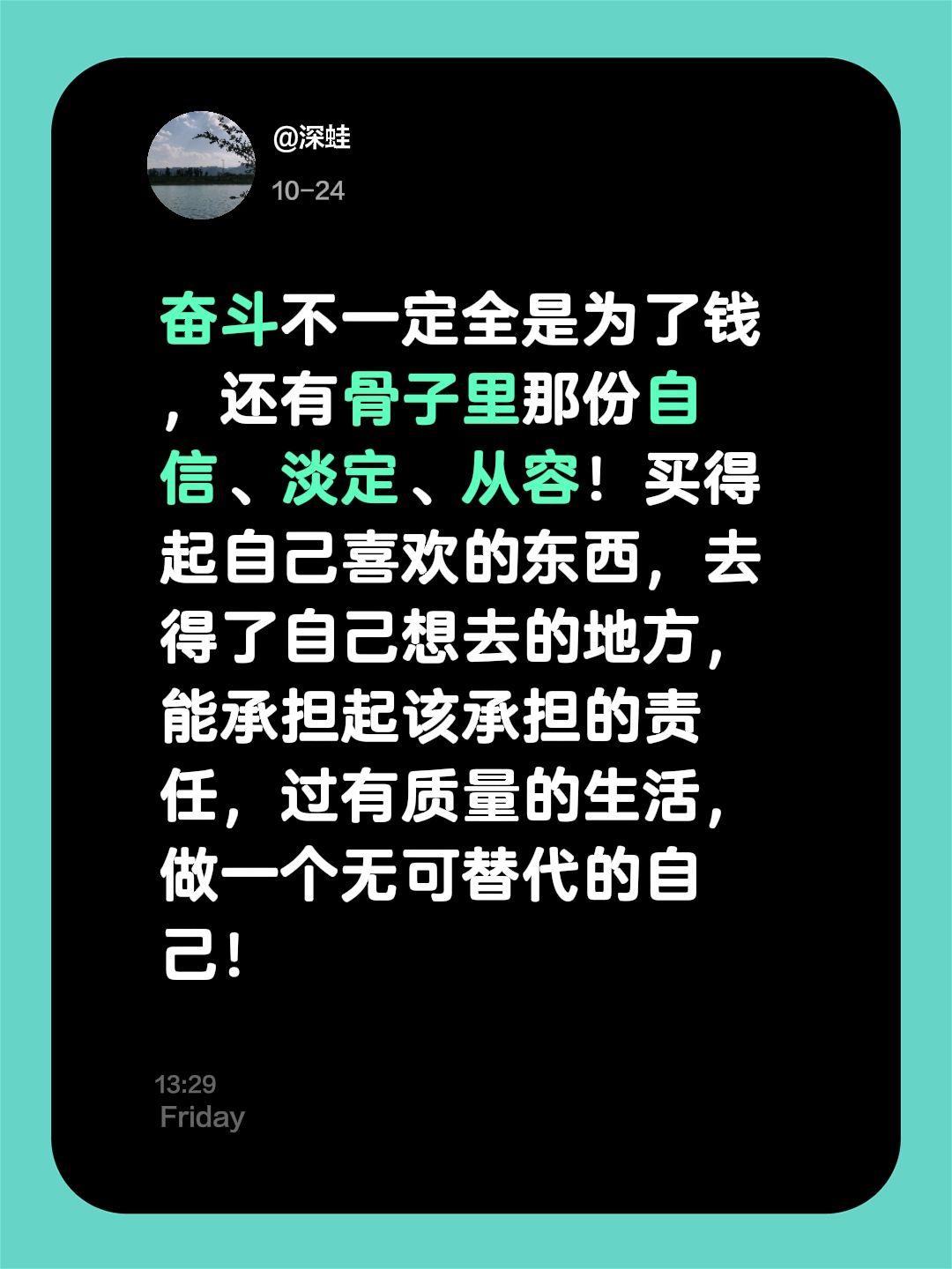 奋斗不一定全是为了钱 ,还有骨子里那份自信、淡定、从容!买得起自己喜欢的东西,去得了自己想去的地方,能承担起该承担的责任,过有质量的生活,做一个无可替代的自己!