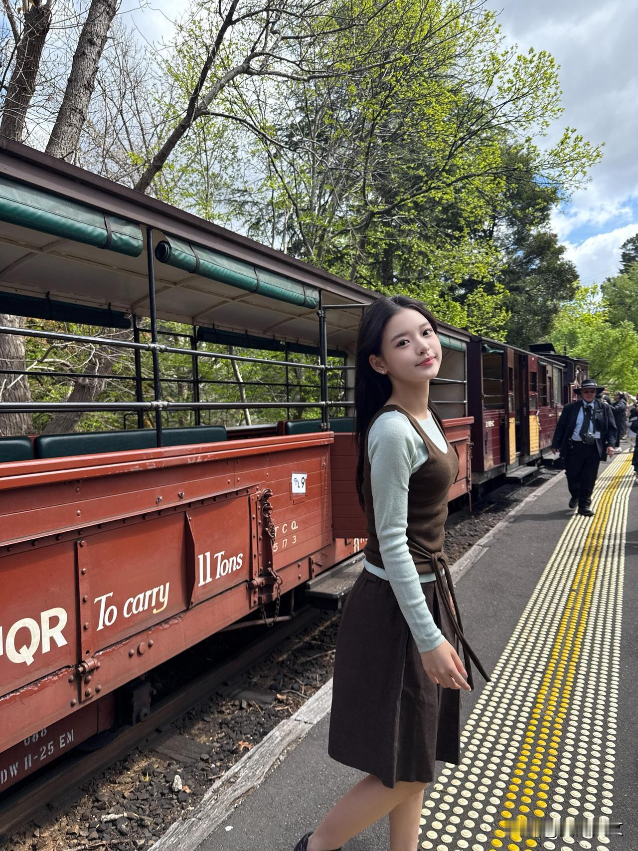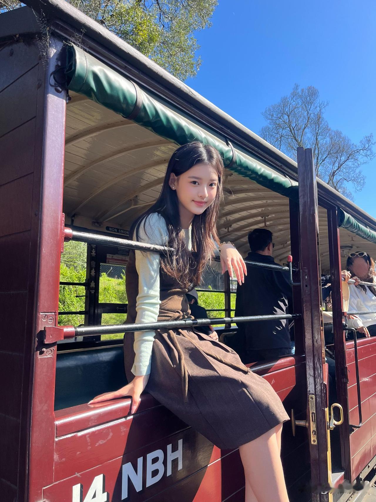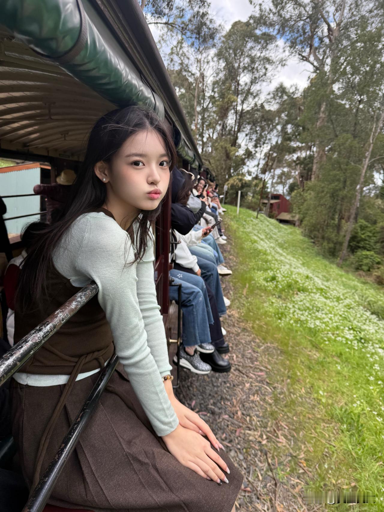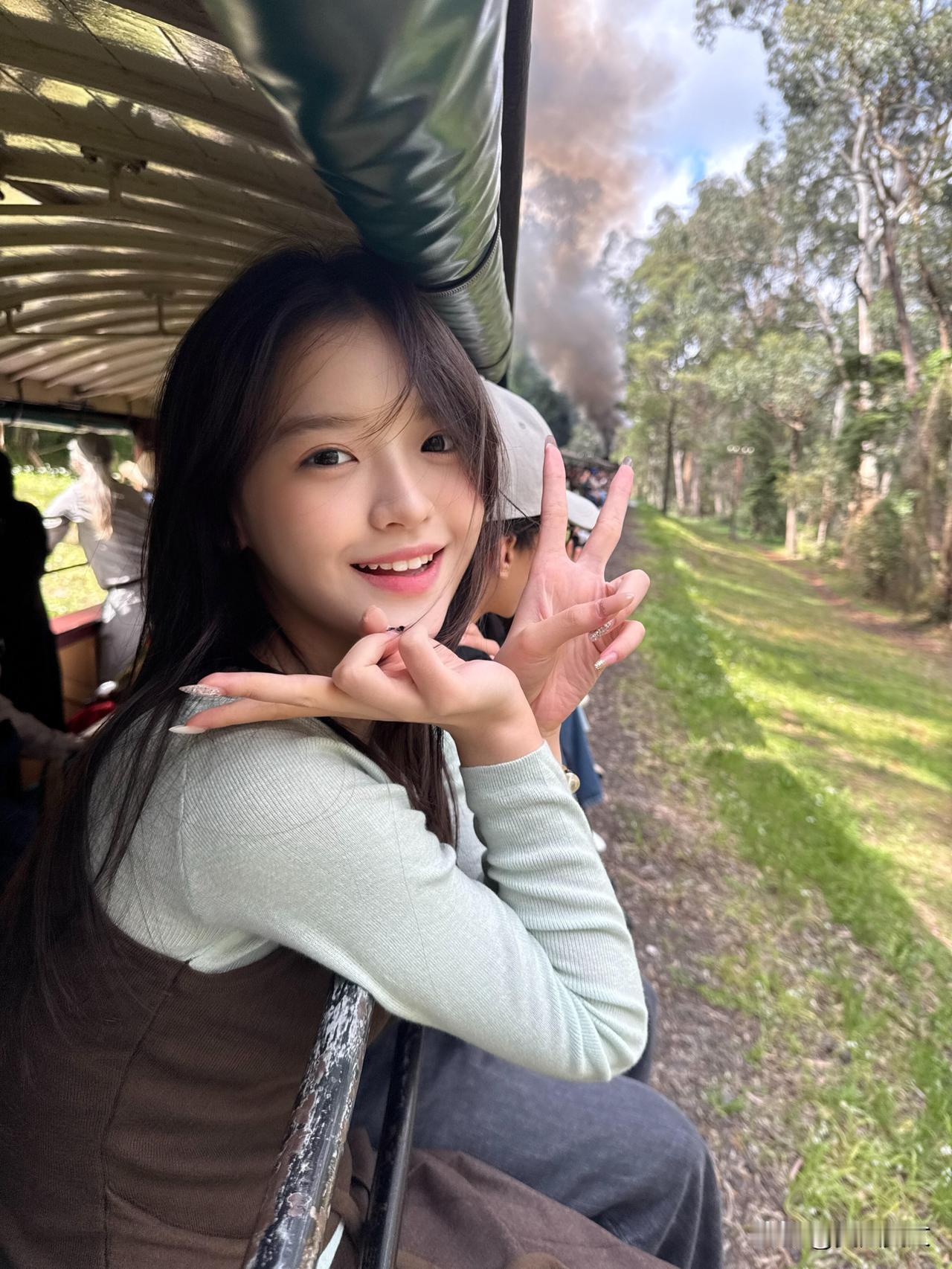 少女乘着绿皮火车,悠然自得地欣赏沿途风景。