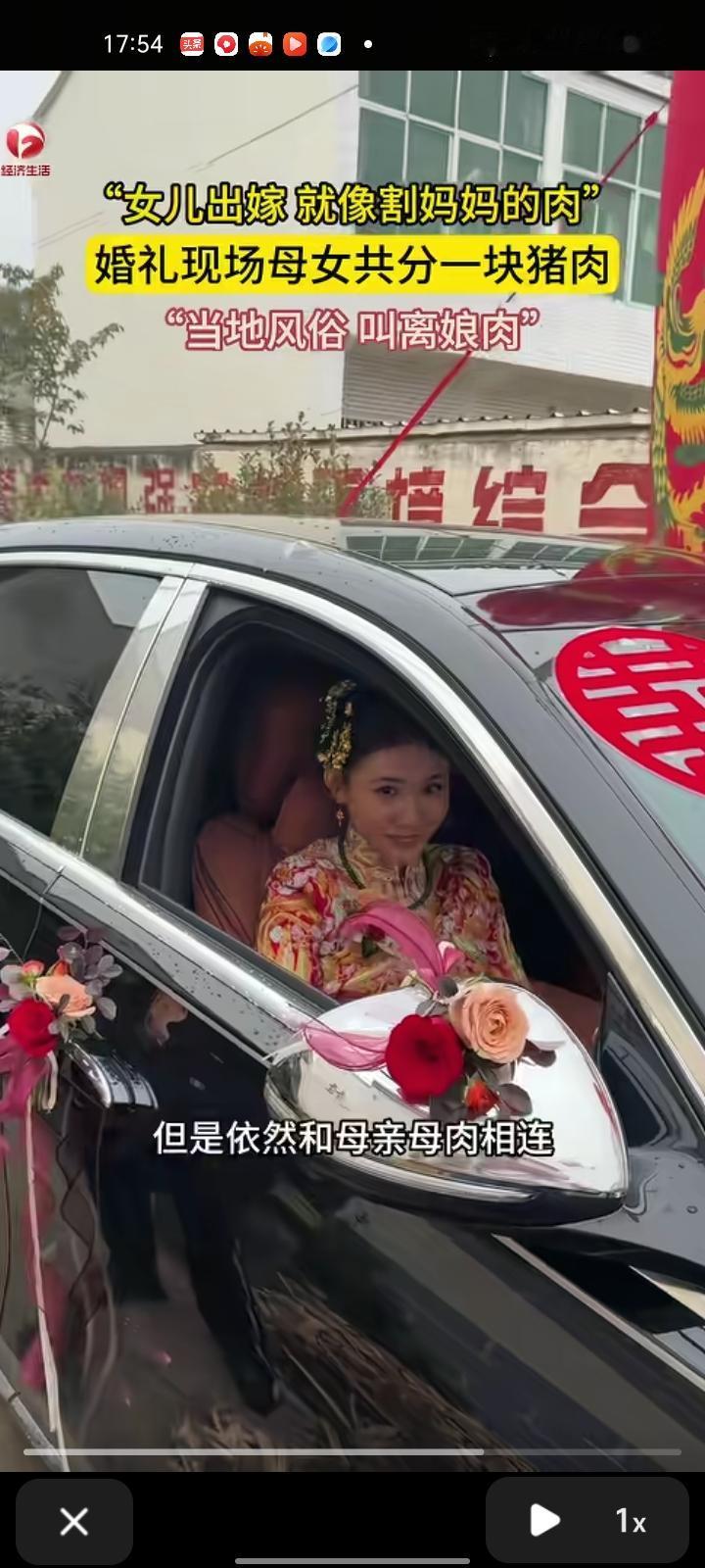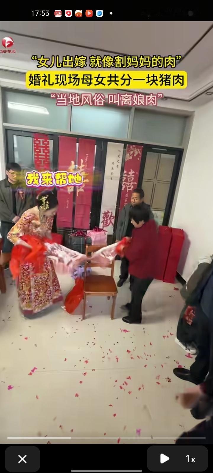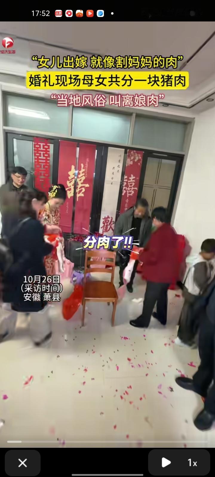 10月25日,宿州市萧县。婚礼现场母女俩共分一块猪肉,一拉就分开了。新娘姐姐孙女士称,女儿出嫁后离开母亲,但依然和母亲骨肉相连。女儿出嫁了但妈妈心里不舒服,像是割妈妈的肉,故称为“离娘肉”。