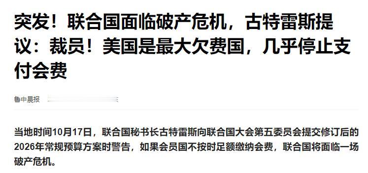 联合国又来要钱了,这次要钱要的很绝,很干脆,秘书长古特雷斯直接放狠话:不交钱就裁2681人,2026年预算砍15%,连“破产”俩字都抛出来了,看着是急到火烧眉毛,可明眼人都知道,这出戏的病根全在美国身上。 要知道联合国的 “饭票” 里,美国那一份最肥,常规预算占 22%,维和预算更是要扛 26% 的大头,相当于 193 个成员国里,它一个人要出近四分之一的钱。 可现在这 “金主” 成了头号 “老赖”,截至 2025 年 10 月,美国光常规预算就欠 15 亿,维和及法庭费用再拖 13 亿,累计 28 亿美元的窟窿,占了联合国总欠费的七成多。更狠的是白宫直接放话,2026 年要全面停缴维和资金,这哪儿是欠费,分明是要断联合国的活路。 这可不是一时兴起的赖账,美国这 “老赖” 名号都戴了 30 多年了。1986 年国会通过个《卡萨巴姆修正案》,就单方面要求把会费比例降到 20% 以下,还逼联合国冻结预算,从此就把欠费当成了要挟的筹码。 说白了就是 “先照我意思办,再谈钱”:1992 年要打海湾战争求联合国放行,就乖乖清了欠款;后来联合国不支持伊拉克战争,立马又开始拖;911 之后要借联合国名义打塔利班,再一次还钱,转头分歧一出现,欠费的老毛病又犯了。现在更直白,对联合国的人权机构、巴勒斯坦相关决议不满意,就拿会费撒气,哪还有半分大国担当? 美国欠的钱可不是小数目,要知道联合国 2026 年的常规预算砍完才 32.38 亿美元,美国这 28 亿欠款差不多能顶上年预算的九成。更要命的是这钱直接卡着全球的安危。 联合国维和部队已经被逼得减员四分之一,苏丹达尔富尔的维和士兵连装甲车维修零件都快断供了,2014 年刚果(金)的冲突里,就因为经费不足,蓝盔部队连冲突都控制不住,差点自身难保。 人道主义援助更惨,也门的粮食救济项目因为缺钱停了一半,当地每天都有孩子饿死,美国却拿着每年 7000 亿美元的军费当没看见。要知道它一架 “全球鹰” 无人机就值 1 亿,28 架的钱刚好能填上欠联合国的窟窿。 联合国自己早就勒紧了裤腰带,日内瓦万国宫的自动扶梯停了大半年,工作人员只能爬楼梯,冬天暖气温度降了 5 度,办公室照明时长砍半,连公务旅行都得审批三遍,能视频开会绝不出差。 可就算这样,到年底赤字还可能突破 4.5 亿美元,明年初还得给会员国退 3 亿抵扣款,等于兜里没粮还得往外掏钱,古特雷斯说 “要耗尽所有流动资金储备” 真不是吓唬人。 他想过办法,比如提议暂停退还上一年的未用款项,可 193 个会员国吵来吵去没共识,毕竟谁都不想让自己的钱 “被挪用”。 更讽刺的是,多数国家其实都交了钱。截至 2025 年 9 月,141 个会员国足额缴了常规预算,连很多发展中国家都没拖后腿,偏是美国这样的发达国家带头赖账。 中国常驻联合国副代表戴兵早戳破了真相:“会费大国长期欠费是造成联合国流动性危机的主要原因”,还直言得让发达国家承担起责任,不能光把担子压给发展中国家。 欧盟国家私下也吐槽,美国一边逼盟友跟着对抗中俄,一边自己欠联合国的钱让大家买单,搞得他们在 “盟友义务” 和 “多边责任” 之间两头为难。 美国自己心里门儿清,欠账的代价其实能承受,毕竟《联合国宪章》规定欠两年会费才会丢投票权,它每次都卡着这个线拖,既不当场翻脸,又能持续施压。 可这算盘打多了,终究是砸自己的脚。以前联合国还能靠着大国共识勉强运转,现在美国把会费当政治工具,连非洲国家都忍不住呛声 “要让欠费国失去安理会提案权”。 说到底,联合国这出 “破产” 戏,就是美国把多边组织当自家工具耍的结果。古特雷斯的狠话与其说是催债,不如说是给全世界看清楚:所谓的 “规则守护者”,正在亲手拆毁自己主导建立的体系。 等哪天联合国真扛不住停摆了,美国再想借多边名义办事,怕是没人愿意搭茬了。毕竟谁会相信一个连 “饭钱” 都赖着不掏的 “盟主” 呢?