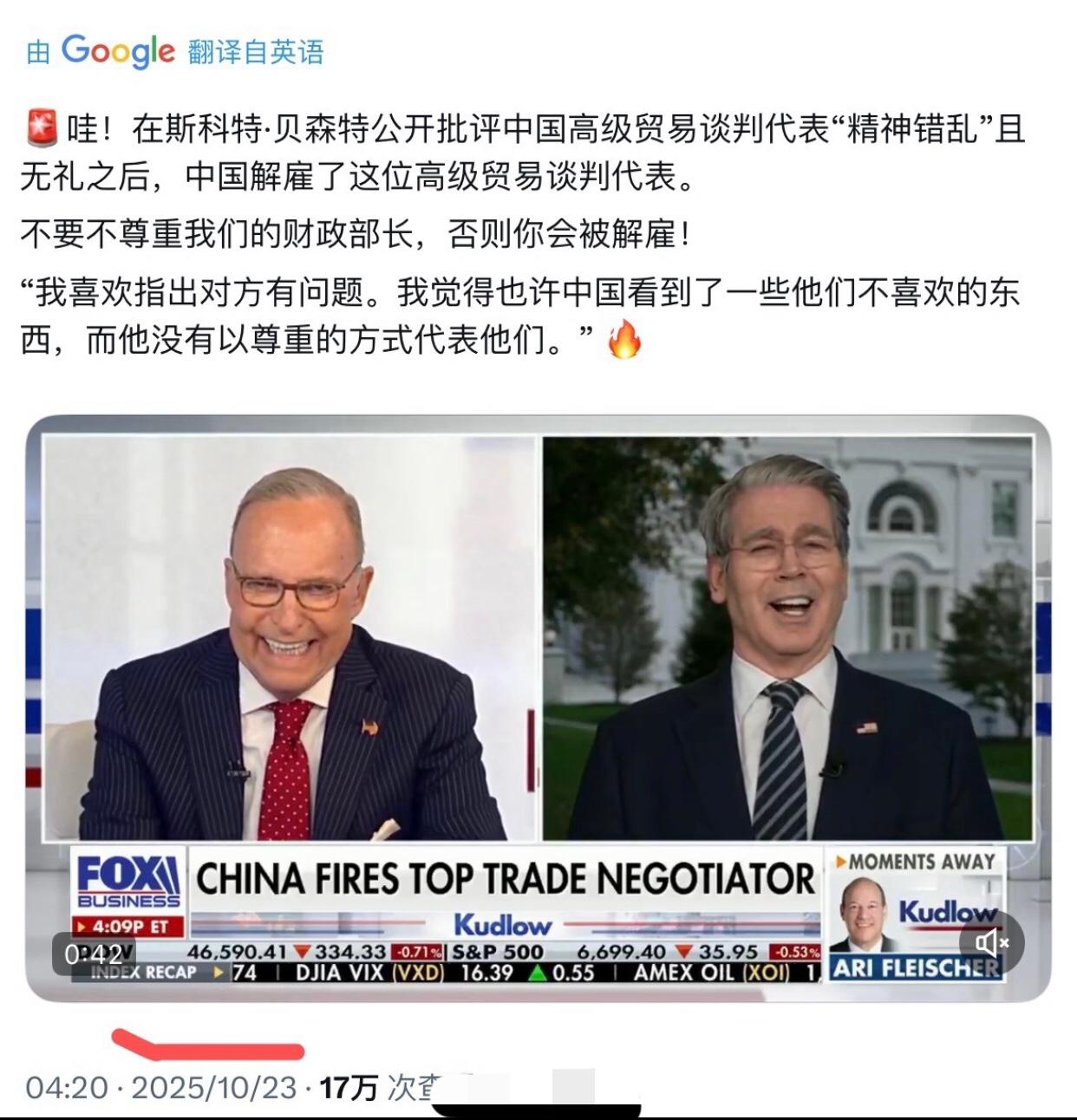 李成刚和贝森特“同框”微笑对比: 中国李成刚是自信稳重的笑! 美国贝森特是虚假得意的笑!