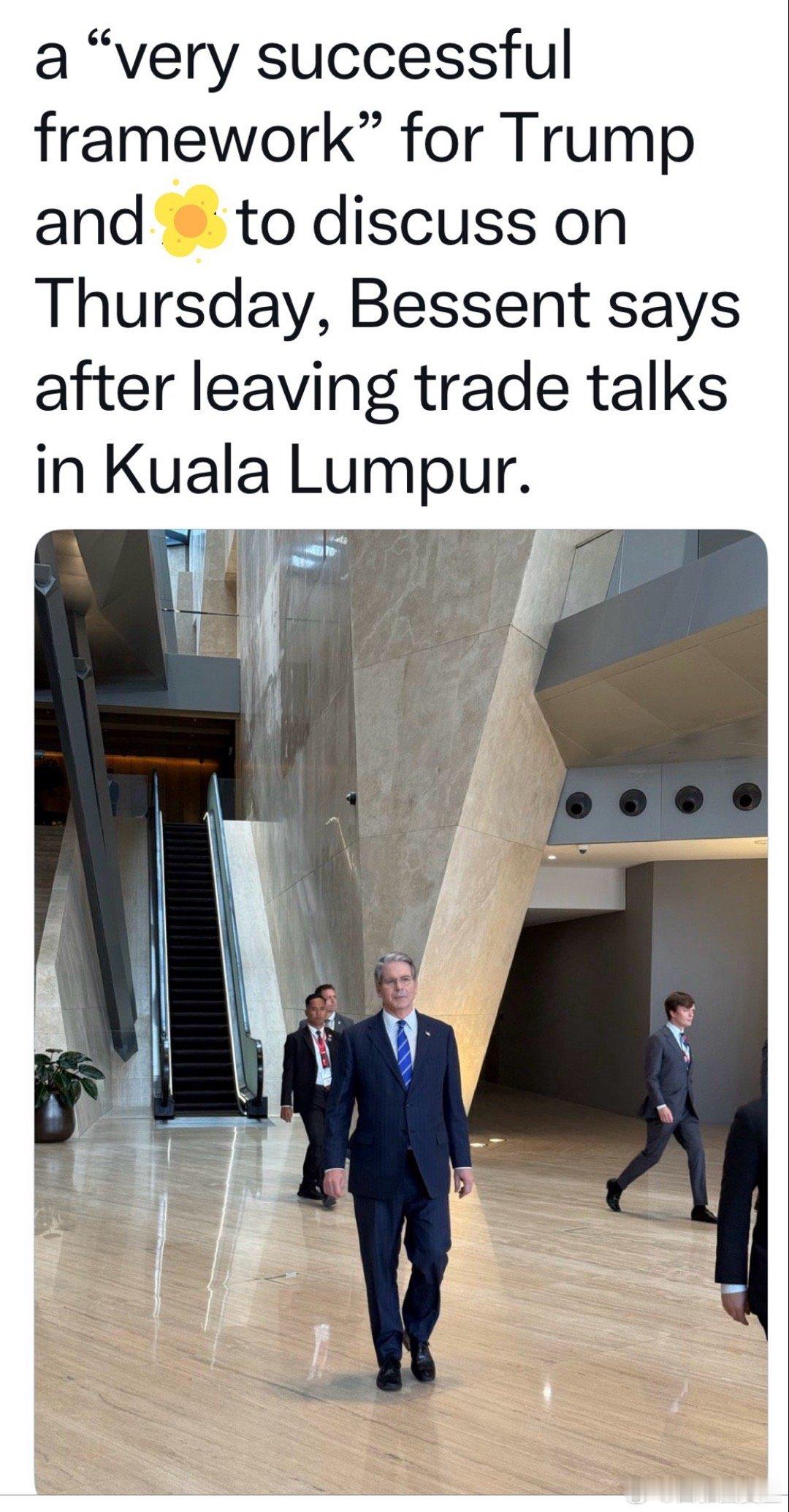 财长在马来西亚:周四,两位领导人见面,会有具体框架协议可以谈,涵盖关税、稀 t u、芬 T N、大豆等内容