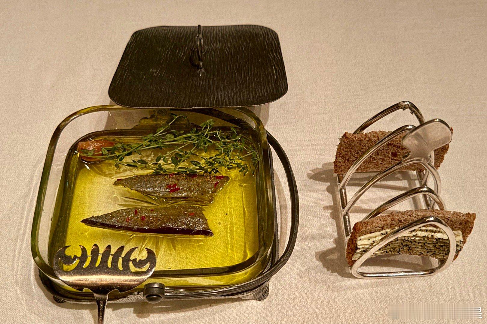 图四是第六道,Auberdine 茄丁鱼。橄榄油里的茄子做成沙丁鱼状,然后配北海道黄油饼干,加蔬菜沙拉。淡香,还不错。之后第七道很特殊,叫“拉面鸡蛋”,蛋黄是鸡汤/ 红味增/ 拉面浓缩物,蛋白是白芝麻和奶油,吃起来是浓缩了骨汤拉面味道的冷啫喱,真是罕见。