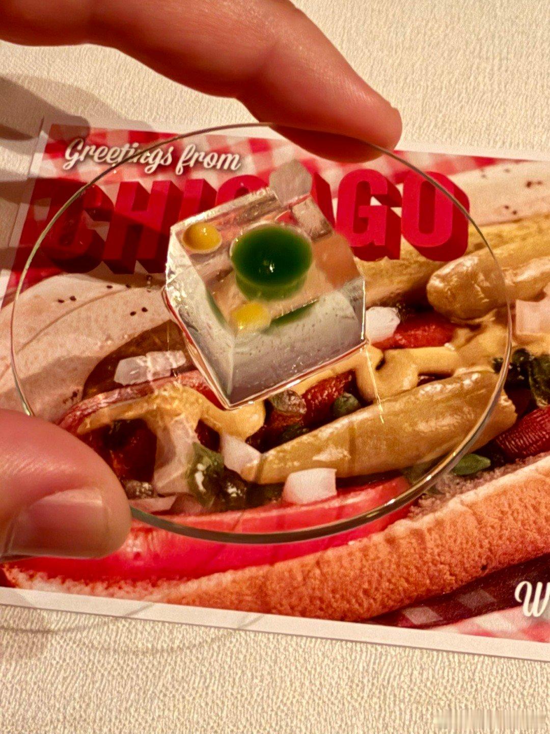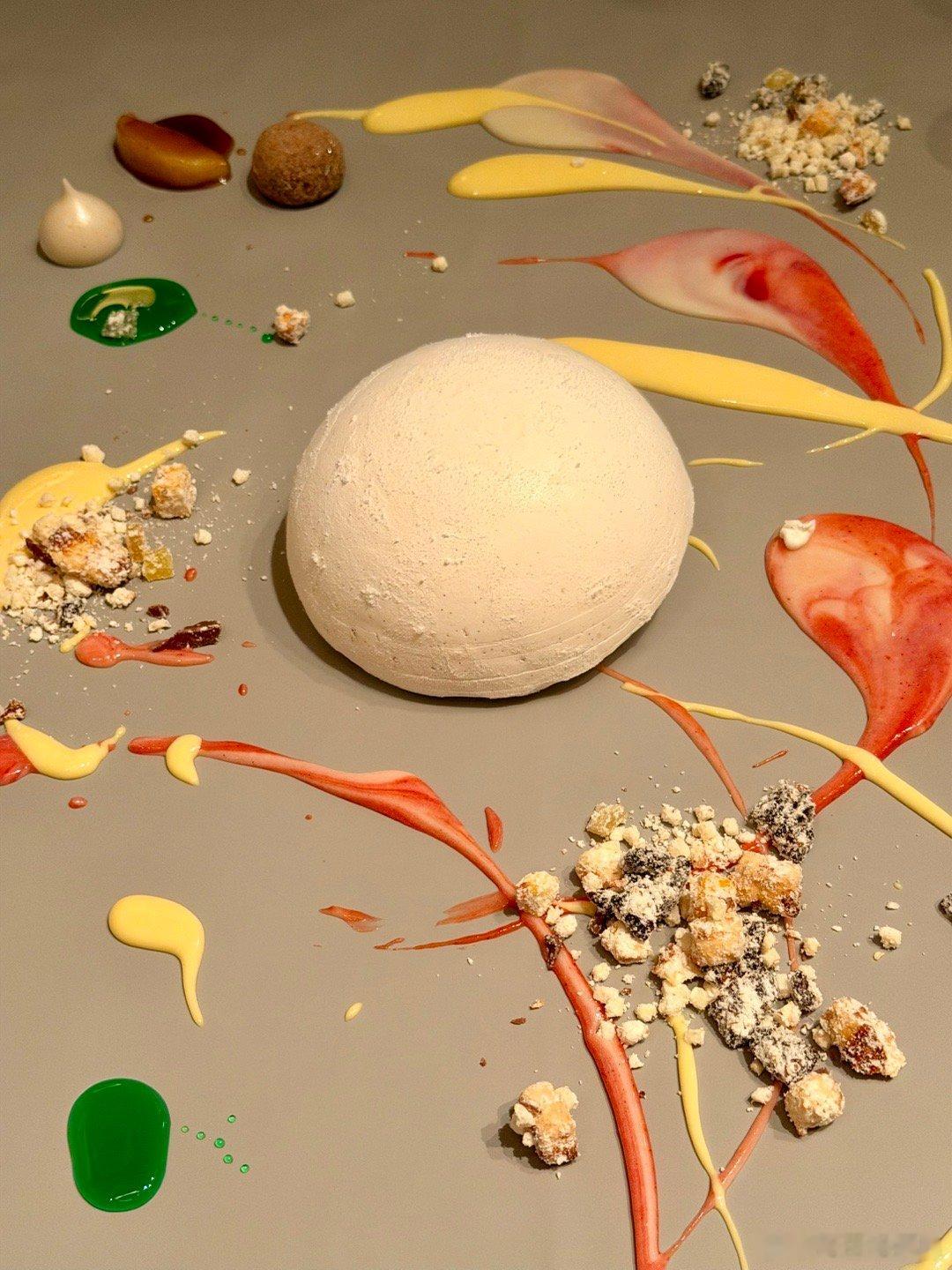 第十一道是主菜昆布烤梨和松茸、熊本牛、还有松子酱。标准的主菜,味道中规中矩,就是量少了。之后是Alinea的传统点心,勺子上的黑松露帕玛森芝士小笼包,咬破了满口香。最后的甜点是肉桂苹果氢气球和绘画桌布,半球是香草冰激凌,芝加哥的是白巧克力,这次的桌布画比芝加哥的好吃。