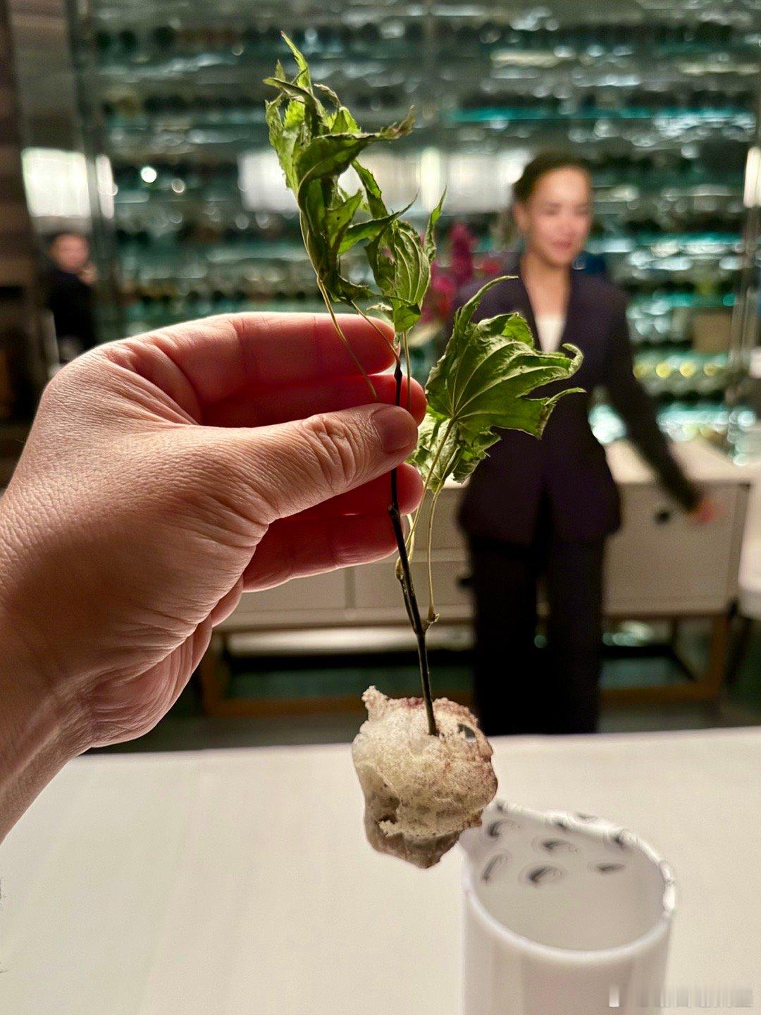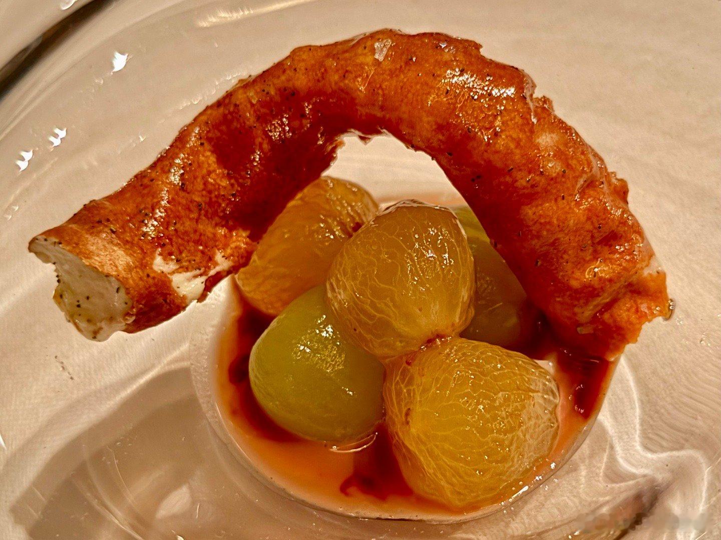 第八道是加州雷吉斯鱼子酱,容器和芝加哥的一样,但酱料是烤酱油的奶油和日本清酒啫喱,咸香口,和芝加哥味道完全不同。第九道和芝加哥的完全一样,热土豆块和冷土豆汤,配佩里戈尔黑松露和帕尔马干酪,拿起来拔针,串烧掉进冷汤,冷热混合一口香。