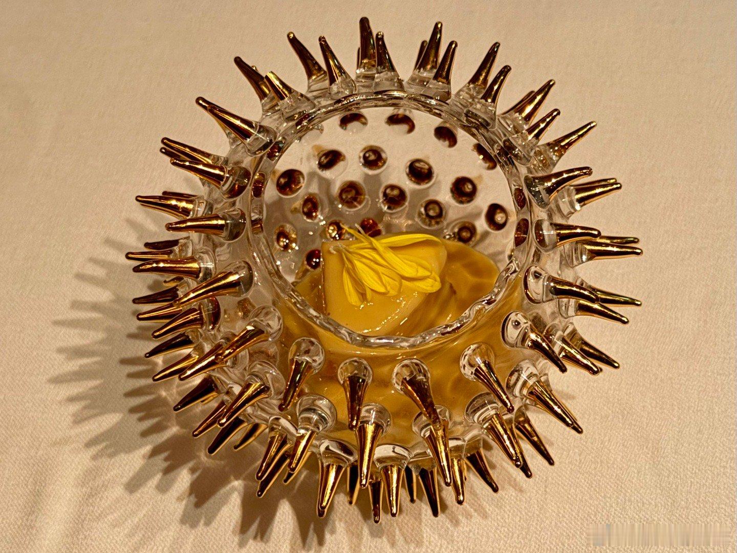图3是第四道,北海道紫海胆泥和柿子。真是香甜可口,而且海胆容器太有特色了。第五道是芝加哥吃过的菜,定制的树脂容器上面放着烟熏北海道红点鲑,顶部是涂有枫糖浆的脆皮。上等的冷烤鱼,香甜好吃。然后翻转容器,露出悬浮在奶油啫喱中的红点鲑鱼鱼子,配料有胡萝卜,用勺子挖着吃,味道也不错。