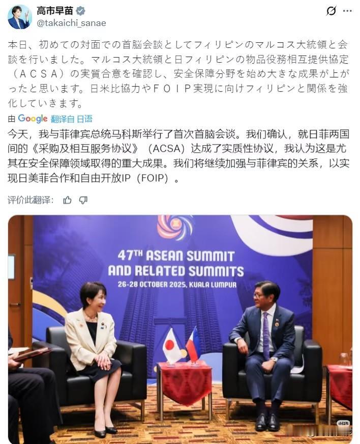 正在马来西亚的高市早苗称:为实现日美菲合作和FOIP,我们将加强与菲律宾的关系。2025/10/26