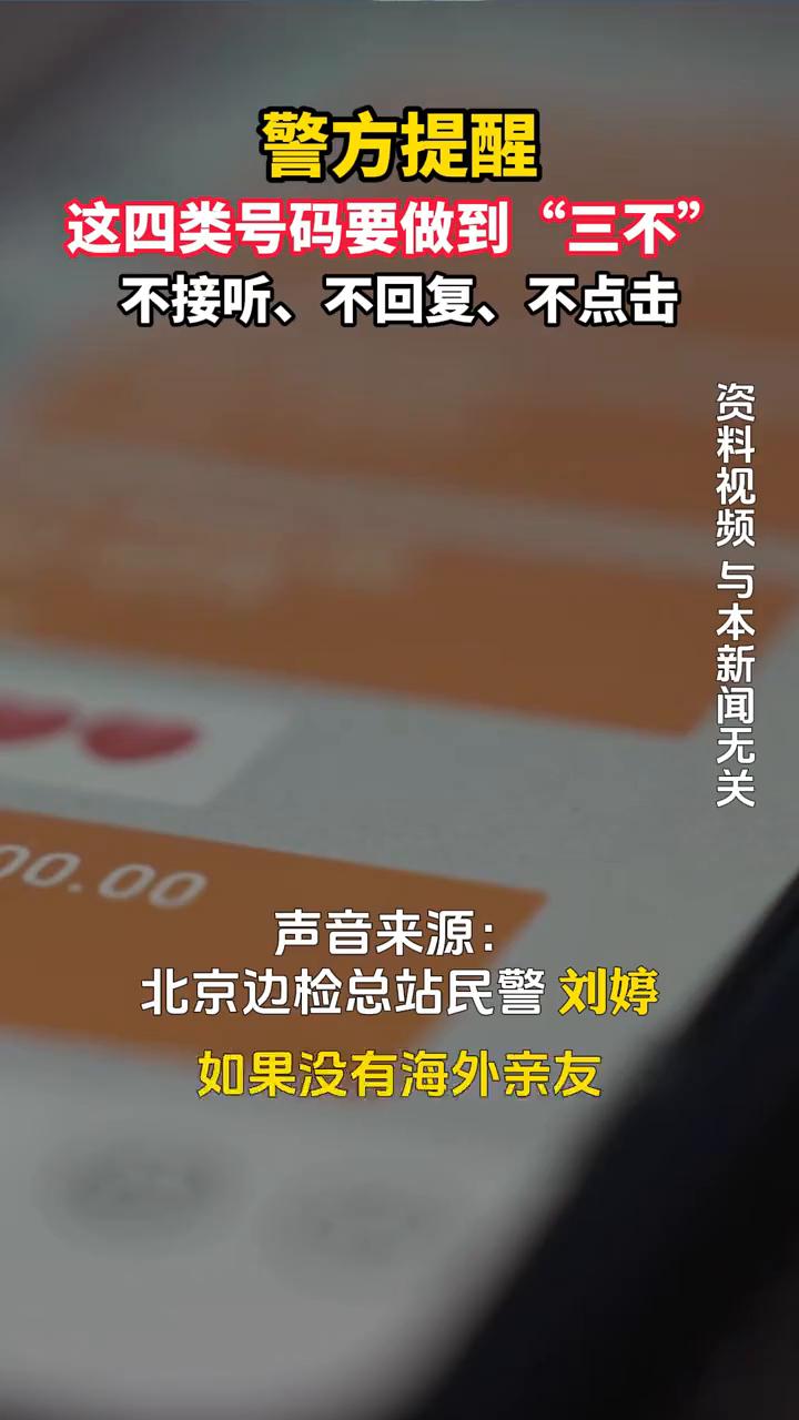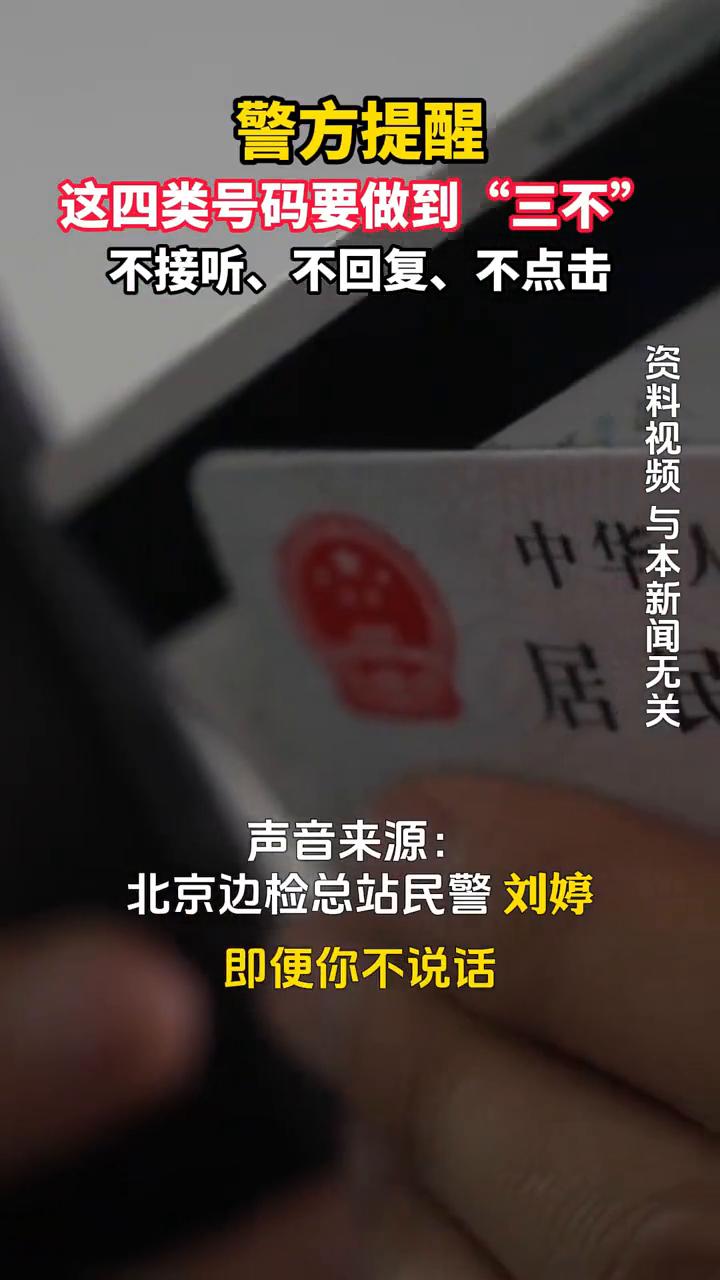 警方提醒:这四类号码要做到"三不",不接听、不回复、不点击。 北京边检总站民警刘婷。 如果有这四个号码给你打电话千万不要接听,即便你不说话也可能面临财产损失。 ·第一就是四零零开头的号码。很多企业都是四零零的电话,但是不具备外呼功能,所以一旦接到不要犹豫直接挂断。 ·第二是零零开头的号码。这种是国际长途电话,如果没有海外亲友基本可以判定是海外诈骗电话。 ·第三就是九五开头的八位数号码。虽然银行也是九五开头的号码,但是人家是五位,所以一定要注意区分。 ·第四就是零幺六九开头的号码。这种不仅有电话还有短信,这种就很容易让你欠下网贷。 所以接到以上四种电话一定要做到不接听、不回复、不点击。拒接陌生人来电 电话