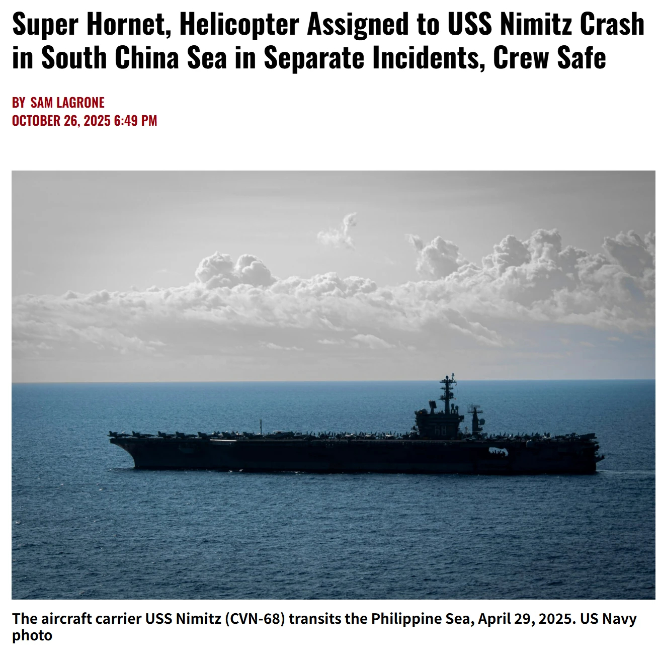 尼米兹号在南海掉了一架F/A-18F和一架MH-60R,以前还掉过一架F-35C2架美军机在南海相继坠毁