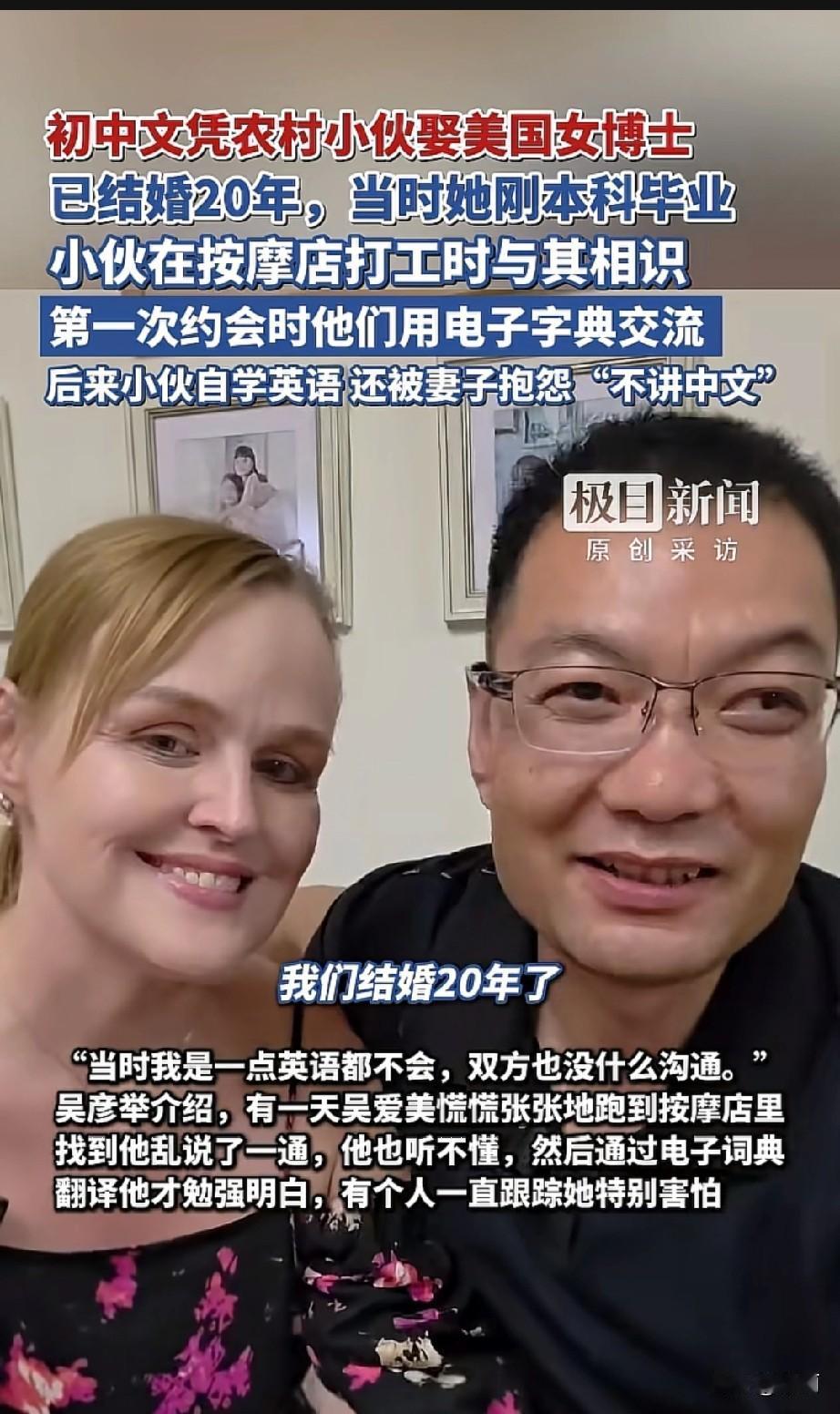 河南禹州农村的吴彦举,初中辍学后在新疆按摩店打工,18岁因工伤视力极差,连视力表最大的E都看不清 。2004年,他遇到刚美国本科毕业的吴爱美,靠电子词典交流。吴爱美遭跟踪时,他挺身而出驱离骚扰者,次月两人确定恋爱关系。 2005年领证时,交完招待所房费只剩一顿饭钱,婚宴是镇上几碗面条。如今吴爱美成了博士、幼教老师,两人结婚20年,育有两女,小女儿游泳达国家一级运动员水平 。 吴彦举自学英语,吴爱美包容妥协,争执时总顺着他。网友说这打破了学历、国籍偏见。其实婚姻从不论外在匹配,他没嫌她负债,她不介意他穷,真心与包容才是能走20年的关键。出身不好也别放弃,爱和努力能抵过一切。