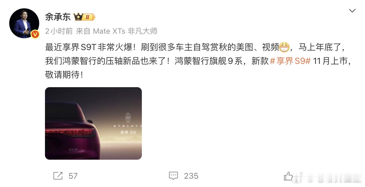 余承东曝新款享界S9将11月上市新款享界S9最新官图曝光