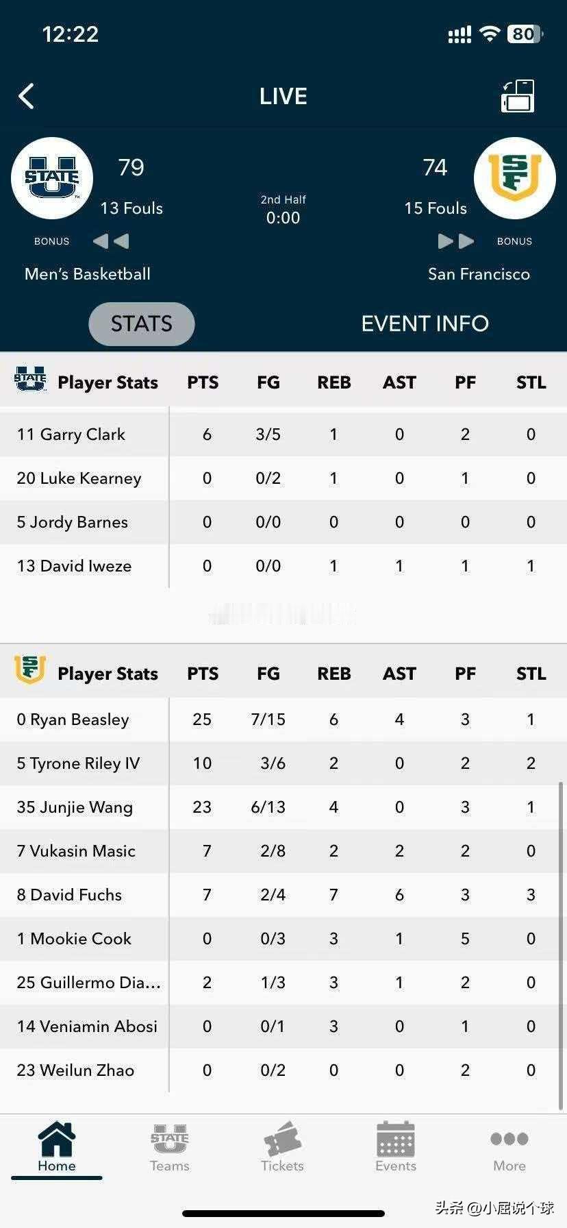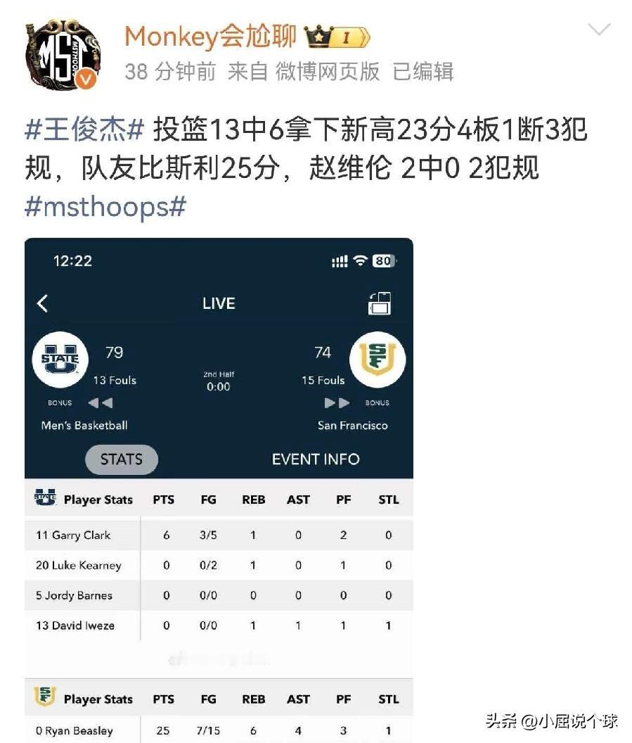 赵维伦首秀得0分!新赛季或许会把板凳坐穿 旧金山大学以74-79不敌犹他州立大学,两名中国球员的表现可谓是冰雪两重天,王俊杰首发出场32分钟,得到23分4篮板1抢断,而赵维伦只获得3分钟的出场时间,2投0中,数据栏只有2次犯规,可以看出他还没有适应。 赵维伦今年20岁,身高,上赛季以探花的身份加盟OTE联赛,场均可以得到13.9分2.1篮板6.6助攻1.3抢断,投篮命中率高达47.8%,三分球命中率达到42.5%,有国青队队友王俊杰在一个队,相信赵维伦会尽快适应球队节奏,赵维伦16岁破例进入意甲成年队,表现远超同龄人,实力还是很出色的,哪怕上赛季在OTE联赛他的进攻和组织能力也是很出色的,希望赵维伦新赛季能够挤进主力轮换,下赛季争取成为首发,加油!