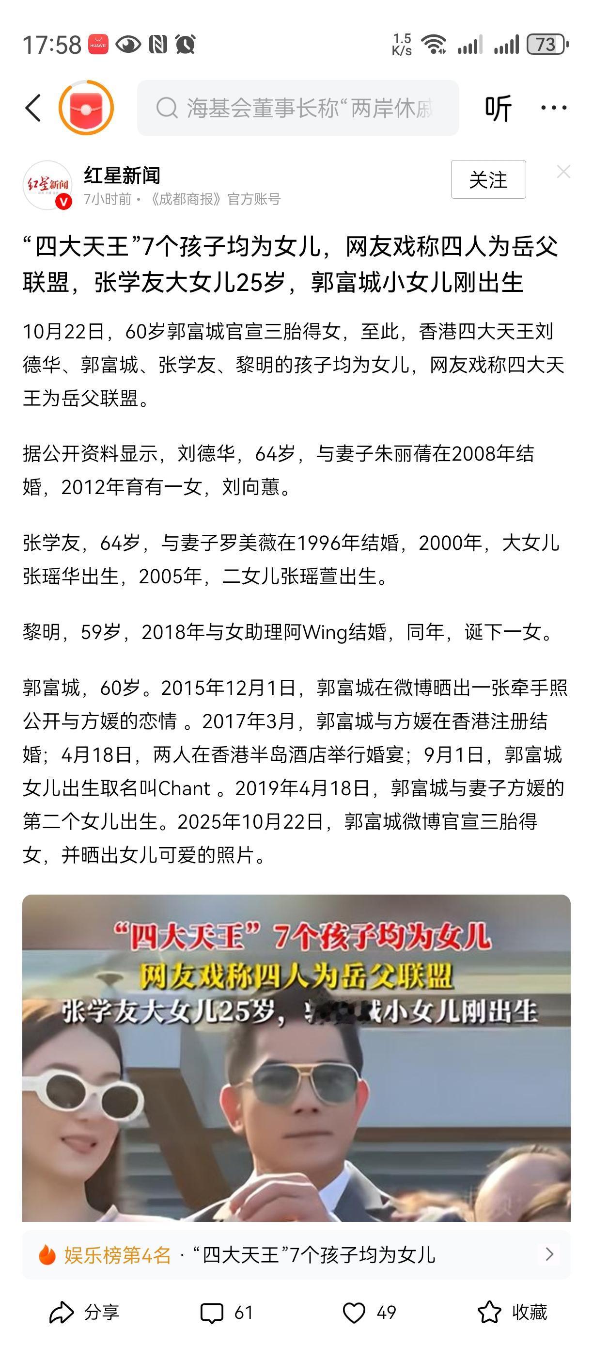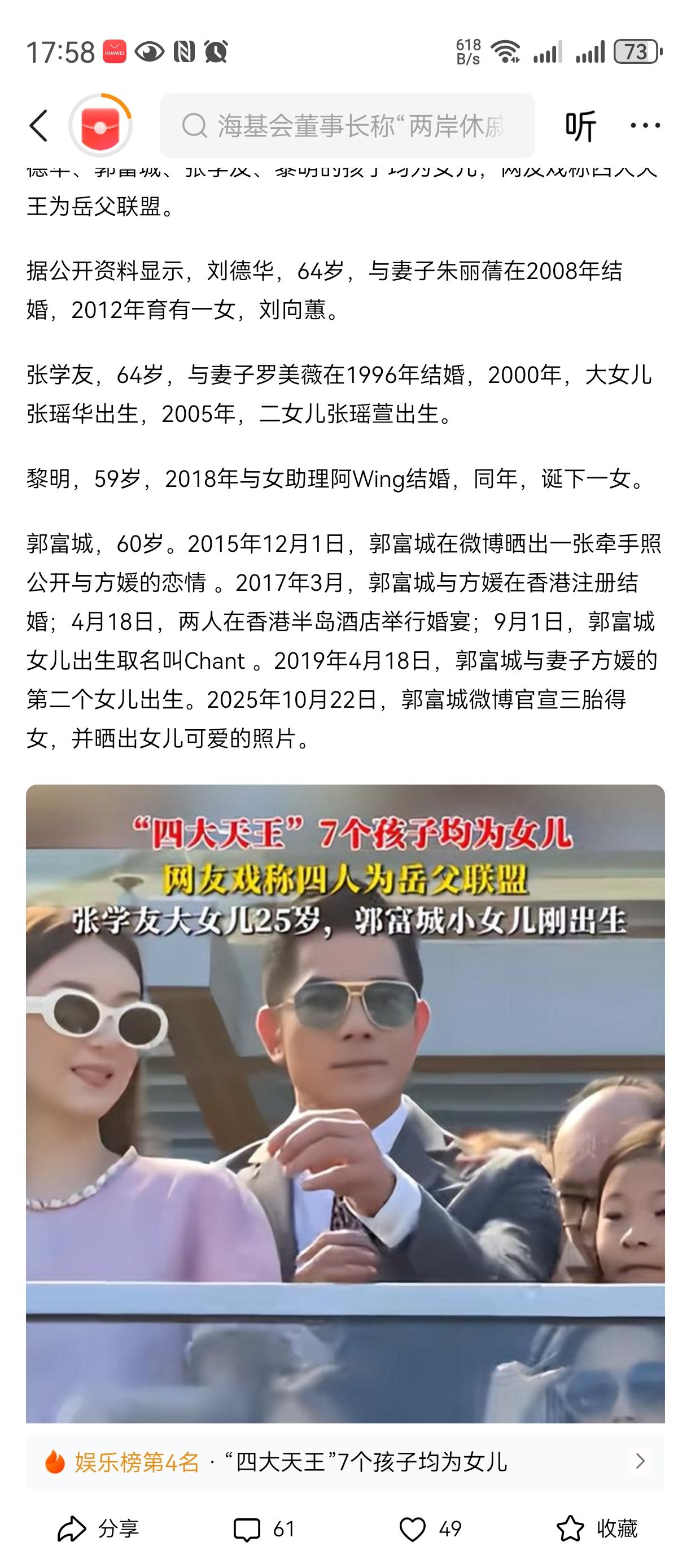 岳父命[呲牙] 四大天王, 还有某一阶段那个啥, 所以生儿生女是天意。 郭富城老丈人家 旧四大天王 儿子又怎样, 女儿又如何, 都是天王的基因, 谁能保证千秋万代都是儿子? 姓名就是一个符号, 说句夸张的话, 女儿生的肯定是自己的, 儿子生的都不一定是自己的[笑哭][笑哭][笑哭]