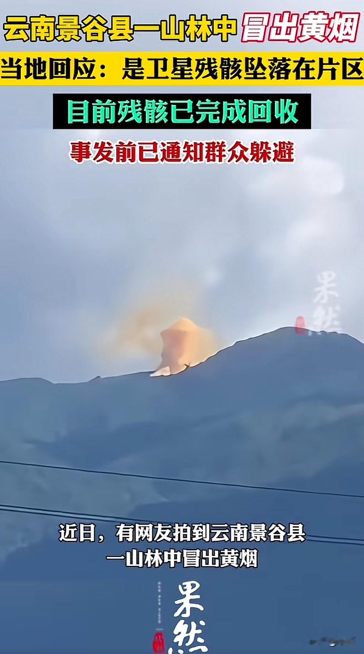 云南景谷县一山林里冒出黄烟,网友拍下画面引发关注。景谷县应急管理局说,是卫星发射后的残骸坠落在这儿,现在残骸已经回收了。 事发前相关部门早通知了群众躲避,还提前疏散了周边上万居民,没人受伤,也没财产损失。 有人担心黄烟有毒,其实这是火箭推进剂残留挥发产生的,专家说属于中等毒性,而且提前疏散已经避开了风险。 火箭残骸坠落是正常现象,落点都经过精确计算,选在人口稀少的区域,还会提前做好疏散预案。那些说“砸到谁谁倒霉”的说法不实,咱们航天发射的安全保障一直很到位,这背后是无数人的精准测算和提前部署。