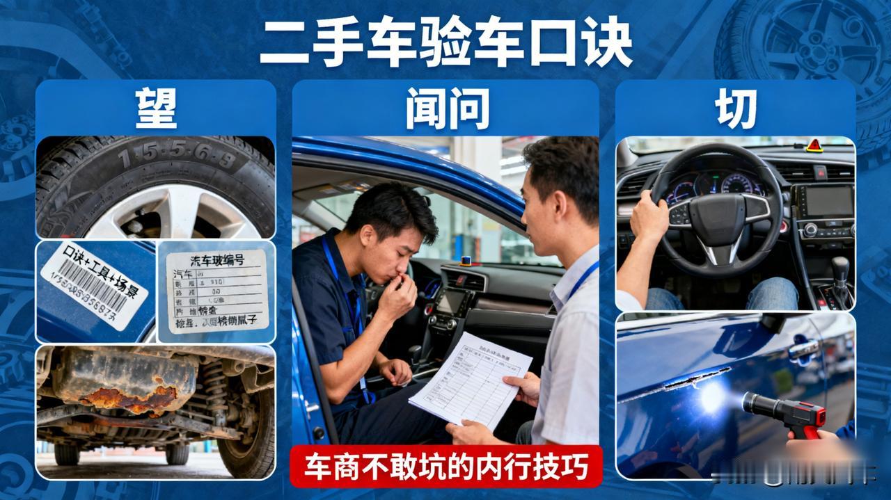 二手车商听到都想拉黑你的验车口诀!记住这5点,避开大坑。 看二手车,记住“望闻问切”:望(看轮胎、玻璃日期是否一致,看底盘有无锈蚀),闻(车厢有无泡水霉味),问(保养记录、过户次数),切(开一圈听异响,试所有功能)。 带上手电筒和磁铁(检查腻子),车商一看你是内行,不敢乱来。 二手车的潜规则 二手车陷阱鉴别 二手车防骗技巧 新车验车 汽车检测验车 验车方法 买车验车