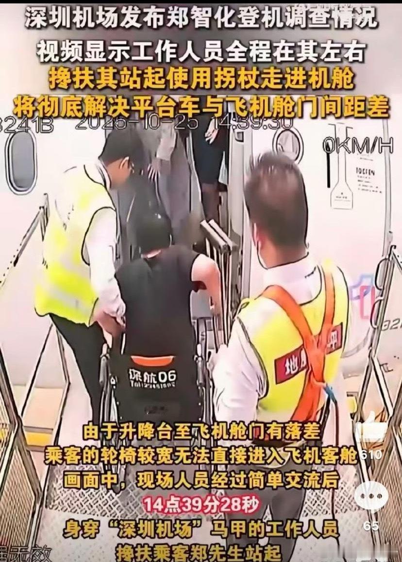 服务人员态度不好说,但视频是全程推行,只是临时轮椅比机舱门宽、他不得不起身进机舱。