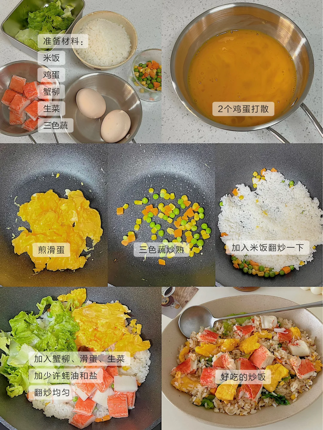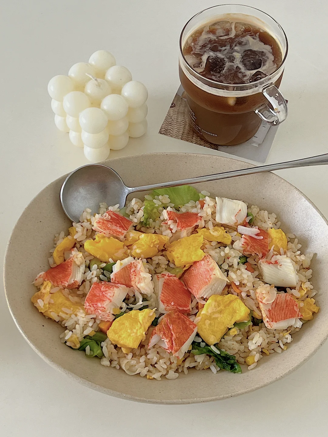 姐妹们,邪修炒饭真的太容易了,我只知道我想吃炒饭,找食材的时候发现了蟹柳,于是对它有了想法💡,几个步骤搞定一盘炒饭,又很好吃😋 做法见图3️⃣ ✨2个鸡蛋打散,煎成滑蛋备用 ✨三色蔬先炒熟,加入米饭翻炒一下 ✨再加入蟹柳、滑蛋、生菜,蚝油、少许盐,翻炒均匀即可 ✨再来一杯冰美式 动手吧,姐妹们,美味一锅出~真的好方便