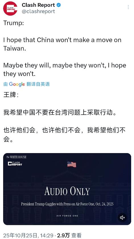 特朗普:“我希望中国不要在台湾问题上采取行动。也许他们会,也许他们不会,我希望他