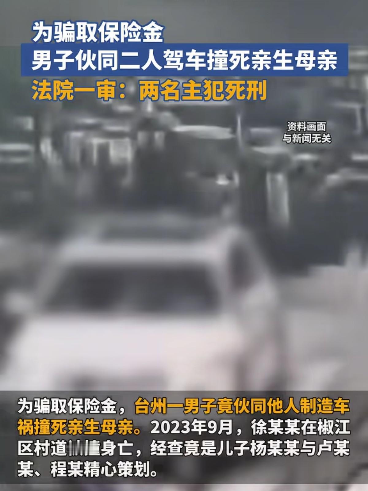 台州这位44岁妇女太悲惨了,生养的亲儿子为了保险金伙同外人图财害命,枕边人丈夫不但不搭救,反而选择默许! 本是一场普通的车祸,只因她得到保险公司给的30多万赔偿款,就让不学无术的00后儿子小卢发现了求财之路。 那可是他亲妈啊!关系再一般,也是母亲十月怀胎生下来的,不感恩就算了,反而处处都下狠招。 2023年小卢和俩初中同学杨某和程谋在挥霍完母亲的赔偿款后,又想戳瞎妈又想戳瞎爸。 他脑子不知道被谁踢了,三个小伙伴儿,怎么就可着自己爸妈祸害呢?! 而且他爸老卢也是个人物,自己儿子要戳他眼球骗保他居然同意了! 当儿子说要用车撞他老婆时他也没意见! 这一屋子男人都不正常啊! 徐某某遇到一个不靠谱的丈夫,又生养了一个白眼狼儿子,唉,一言难尽。