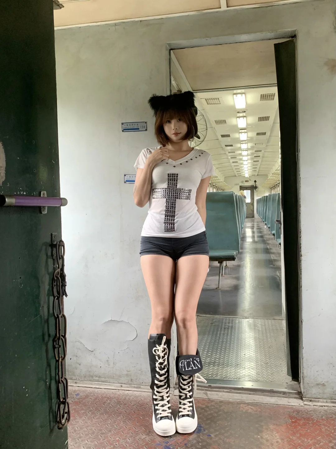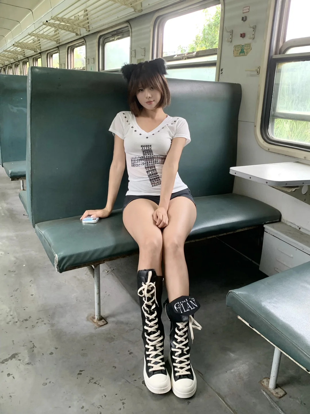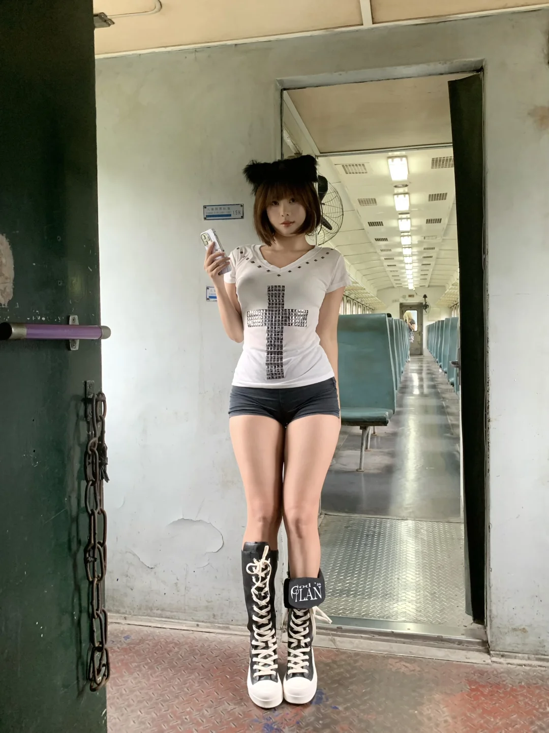 宋妍霏印花超短裙搭配黑色长靴,尽显修长圆润柔美腿部线条!