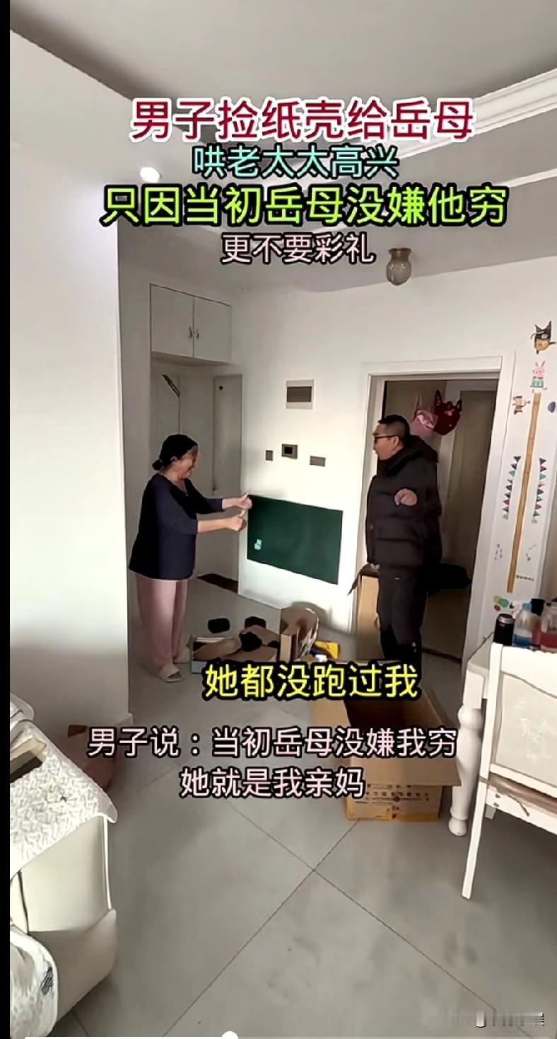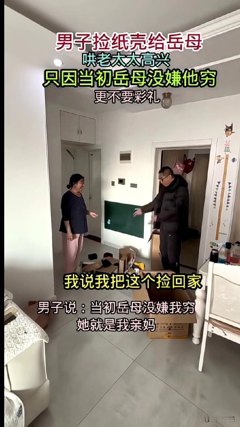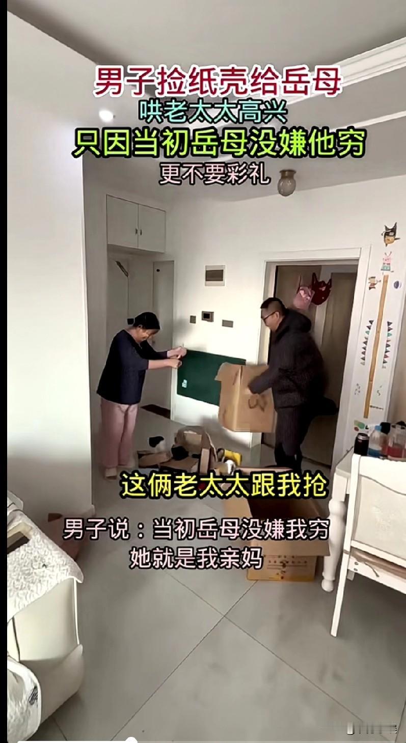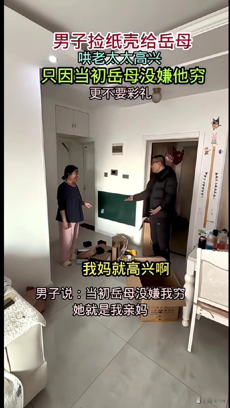 这女婿比亲儿子都亲啊! 一位女婿拎了两个大纸壳箱子,来到了岳母家,男子兴奋的跟前来迎接的岳母说:看看这是啥,厉害吧! 岳母笑着看着女婿。 女婿边说边把一个纸箱倒了一下,把纸箱中的小纸盒都倒在了地上。 岳母看到了这么多的纸盒,笑的直拍巴掌,还双手都给女婿竖起了大拇指。 女婿自豪的接着说:有两个老太太跟我抢,她们都没跑过我,我嗖嗖的!这些老太太当时就不乐意了,问我说你年纪轻轻的抢这玩意干啥呀。女婿和这两个老太太说,我捡这玩意回家,我妈就高兴啊! 这位女婿真的是太暖心了,为了让岳母能高兴,竟然和老太太们抢着捡纸壳箱,哈哈。给老人纸箱子比给他们钱都让他们开心。女婿那一句,我捡这个,我妈就高兴,这一句“我妈”,让人听了暖心,让人感动。 原来当初男子和妻子结婚时,岳母没有嫌弃他穷,更没有要彩礼。男子一直对岳母充满感激之心,男子说当初岳母没嫌弃我穷,她就是我亲妈!而且男子也确实那么做了。 彩礼应该根据男方家庭情况适当的要:有就要,没有就少要或者不要。只要是两人相爱,婚姻幸福才是最重要的!