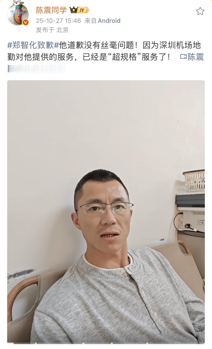 陈震:郑智化道歉没有丝毫问题!因为深圳机场地勤对他提供的服务,已经是“超规格”服务了! 事情发生之后,深圳机场并不是是第一时间澄清,而是直接选择了道歉。这也是服务行业一贯的做法,先化解对方的怒气。 深圳机场直接将监控视频公布了出来,此前支持郑智化的网友都觉得被郑智化的言语骗的,特别是他表述中有“冷眼相待,连滚带爬”完全子虚乌有的事情。 各位怎么看待郑智化吐槽深圳机场这一事情的,欢迎评论区留言。