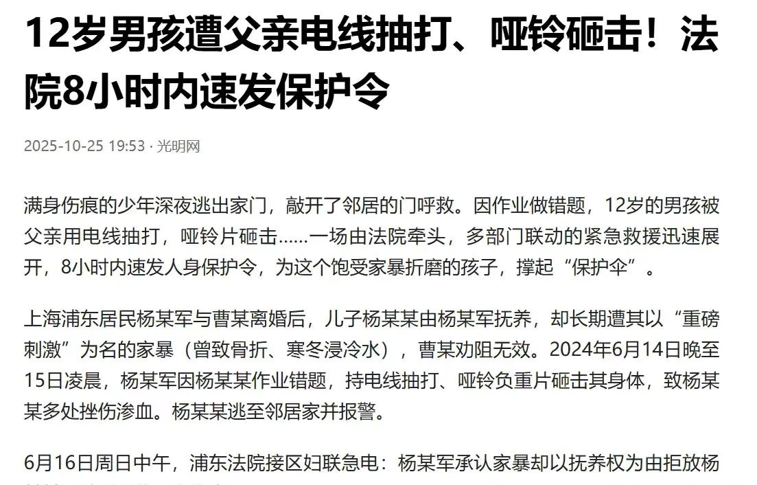 上海,男子和前妻离了婚,一不顺心就打12岁的亲生儿子,他用电线抽打,用哑铃负重片砸击,曾经把儿子打骨折了,还在寒冬里让儿子浸泡冷水,儿子被打得满身伤痕,他忍着痛苦,敲响了邻居的门,意想不到的事情发生了。   上海浦东的深夜,一阵急促的敲门声惊醒了熟睡的邻居。开门瞬间,邻居的心揪成一团:12 岁的小杨浑身是伤,单薄的衣衫上沾着血渍,脸上还挂着泪珠,浑身止不住地发抖。谁能想到,对他下狠手的不是别人,正是他的亲生父亲杨某 —— 这个在离婚后获得抚养权的男人,竟把生活的不顺全都发泄在了儿子身上。 杨某和前妻离婚三年,小杨一直跟着父亲生活。外人眼里,杨某是个沉默寡言的电工,可在家里,他却像变了个人。自从离婚后,他工作不顺心、和人起了争执,甚至只是吃饭时觉得菜不合口,都会把火气撒到小杨身上。最开始是辱骂,后来渐渐升级成殴打,电线、衣架、拖鞋,手边有什么就用什么打。 有一次,小杨数学作业错了三道题,杨某抓起客厅角落的电线就抽了过去,电线抽在皮肤上留下一道道红痕,渗出血珠。还有更过分的,去年冬天,杨某因为工资没按时发,竟逼着只穿单衣的小杨站在冷水里,说是 “让他清醒清醒”,小杨冻得嘴唇发紫,他也毫不动容。 最严重的一次,杨某失手把小杨推倒在地,导致孩子手臂骨折,他却只简单用纱布缠了缠,没带孩子去医院,直到前妻来看望时发现异常,才强行带孩子做了治疗。 小杨一直默默忍受着,他怕父亲打得更狠,也怕自己没人管。可 2024 年 6 月的一个深夜,这场噩梦终于到了临界点。那天杨某在工地和工友吵架,回家看到小杨作业里的错题,瞬间爆发了。他先是用电线狠狠抽打小杨的后背和大腿,见孩子哭出声,又抄起哑铃上的负重片砸过去,负重片擦过小杨的胳膊,立刻肿起一大片,伤口渗出血来。 剧痛让小杨再也忍不住,趁杨某去厨房喝水的间隙,他捂着伤口跌跌撞撞跑出家门,凭着最后一点力气敲响了邻居的门。邻居赶紧把孩子拉进屋,看到他身上新旧交错的伤痕,又惊又气,立刻报了警。民警赶到后,第一时间联系了小杨的母亲曹女士,还带孩子去医院做了检查,诊断结果显示小杨全身多处挫伤,旧伤还未痊愈又添新伤。 本以为报警就能让孩子脱离苦海,没想到杨某却态度强硬,以 “抚养权在我这” 为由,拒绝让曹女士带走孩子,甚至扬言要报复。曹女士走投无路,只好向区妇联求助。让人没想到的是,一场跨越多个部门的紧急救援就此展开。 妇联接到求助后,立刻联系了浦东法院。当天是周日,法院却马上启动应急机制,法官、公益律师、社工第一时间赶到派出所。大家开了紧急联席会议,依托派出所固定的证据和医院的诊断报告,很快认定小杨符合人身安全保护令的申请条件。法院特意开通绿色通道,仅用 1 小时就完成了立案。 下午 3 点,法官在派出所举行听证,杨某依旧坚称自己只是 “教育孩子”,可面对铁证,他终于哑口无言。下午 4 点,法官当场宣读裁定:禁止杨某对小杨实施家庭暴力,小杨暂时由母亲曹女士抚养。1 小时后,裁定书电子送达,民警亲自护送曹女士和小杨回了家。到了傍晚 6 点,派出所和妇联传来消息,杨某已被警告,隐患彻底排除,整个过程只用了 8 小时。 我国反家庭暴力法明确规定,禁止任何形式的家庭暴力,未成年人的身心健康更受法律重点保护。杨某的行为,不仅违背了父爱,更触犯了法律底线。 对此,你们有什么看法,欢迎评论留言~