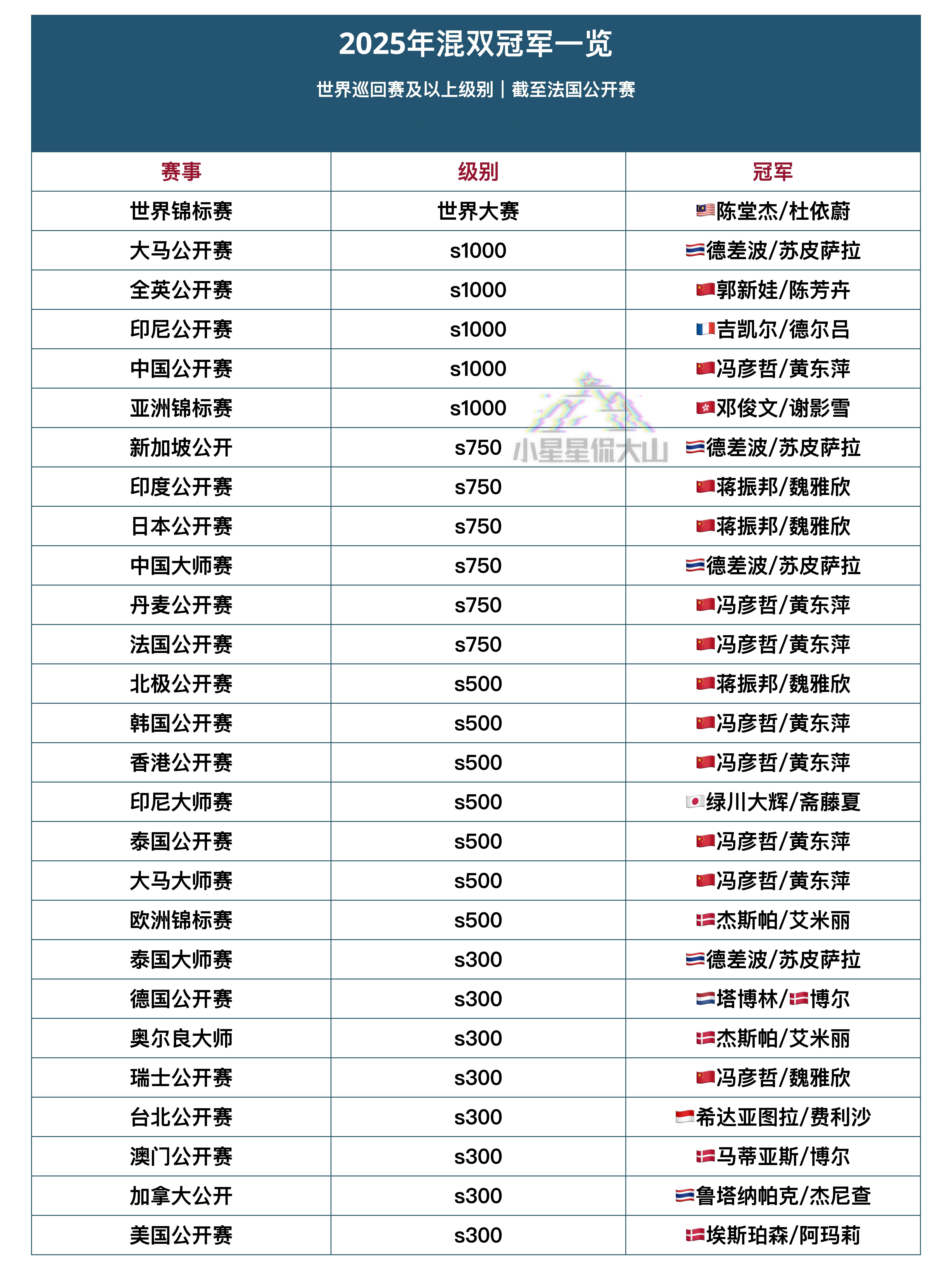 2025年混双冠军一览(截至法国公开赛) ​​​