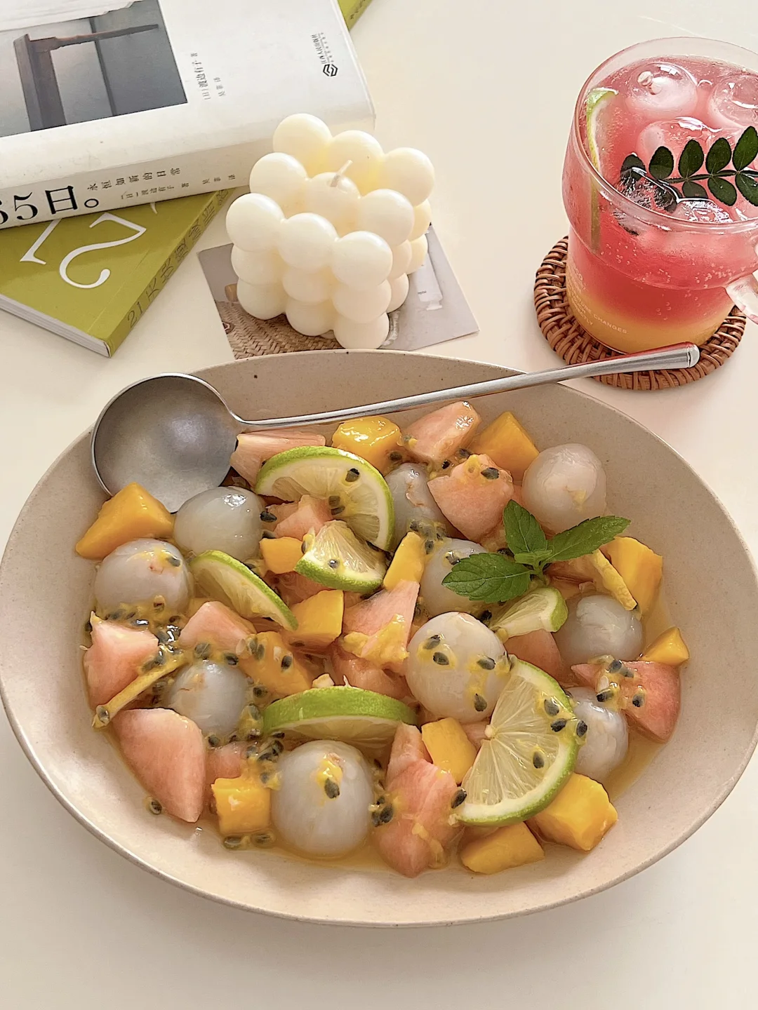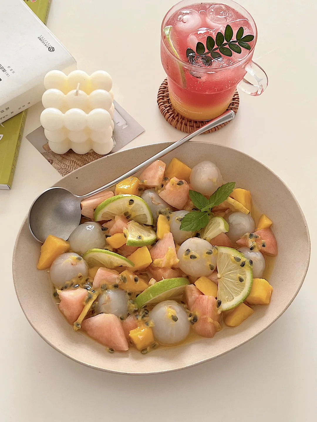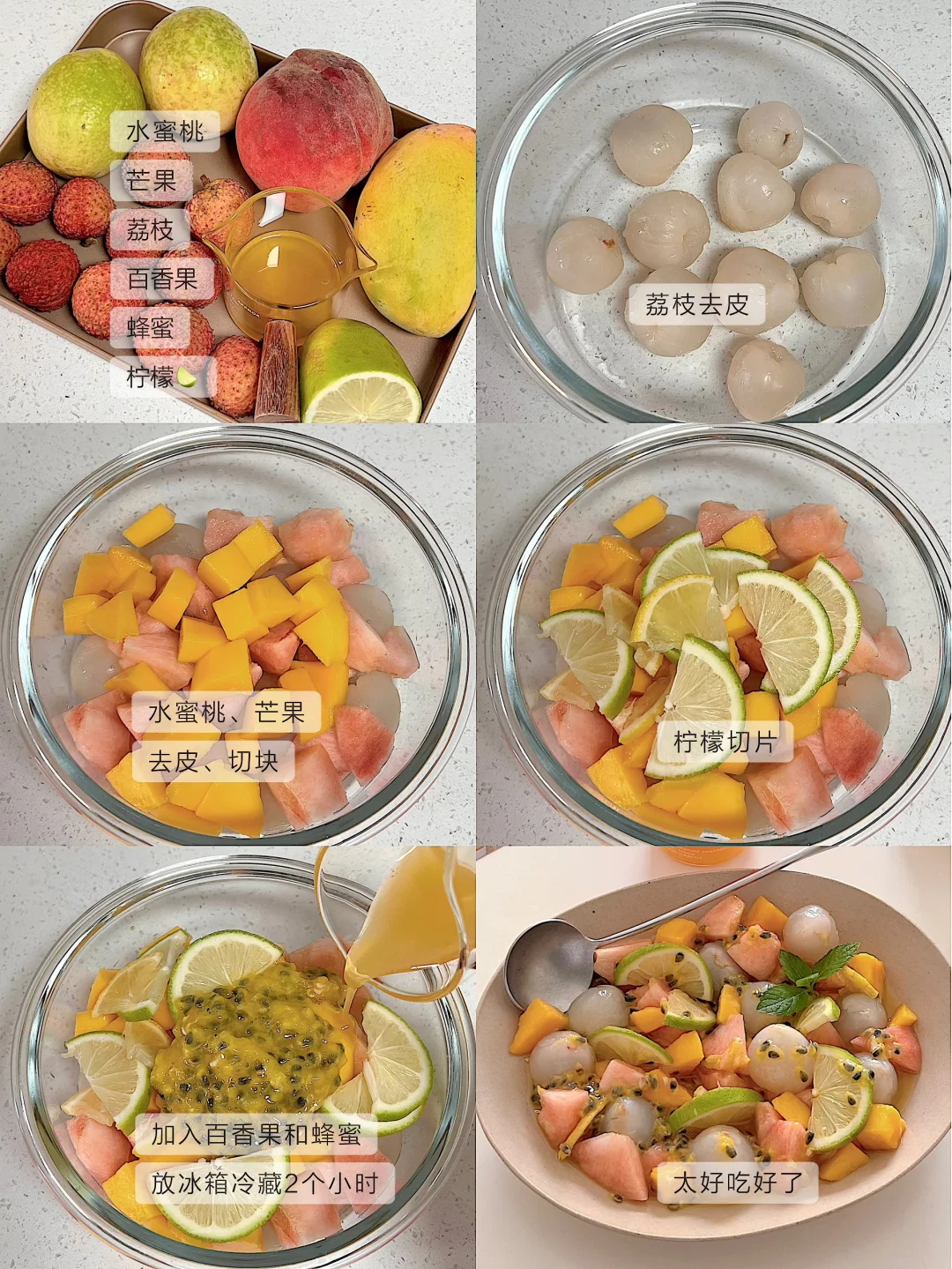 家里还有好多水果, 想办法消耗它, 好吃的渍水果又来了 做法: ✨荔枝去壳、水蜜桃、芒果去皮切块 ✨柠檬切片,加入百香果和蜂蜜🍯 ✨放进冰箱冷藏2小时以上即可 ❄️北方是不是要穿貂了 ☀️我在南方的艳阳里穿短袖吹空调吃水果